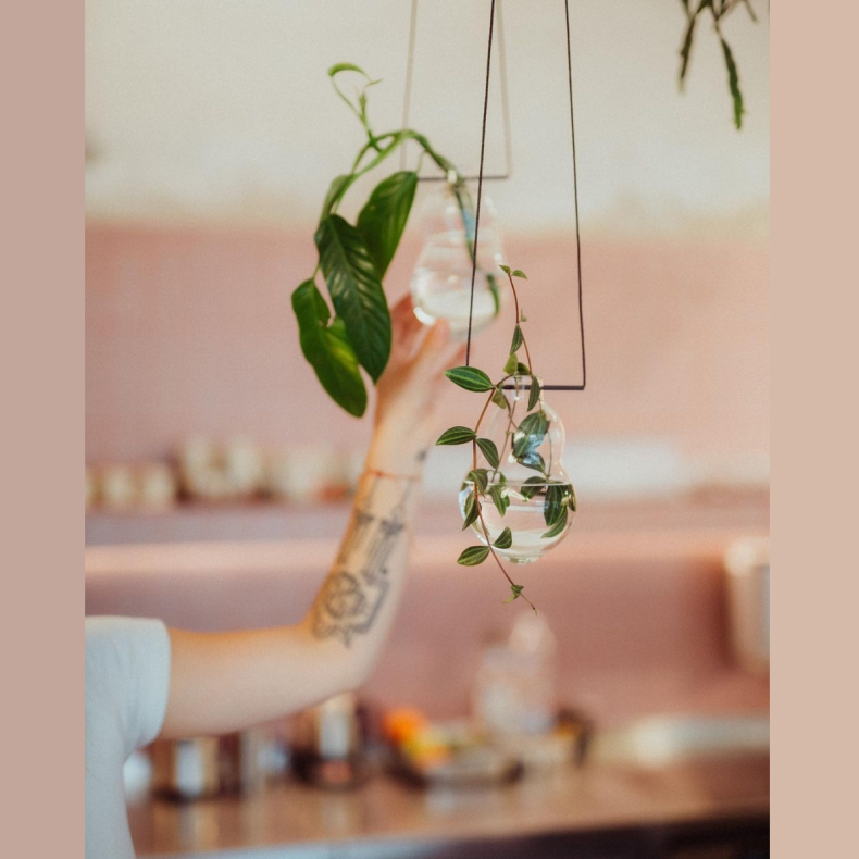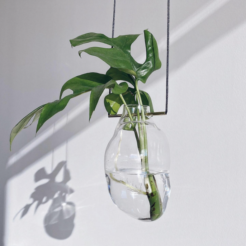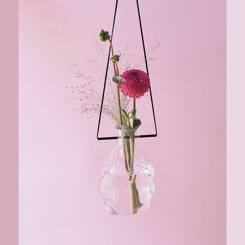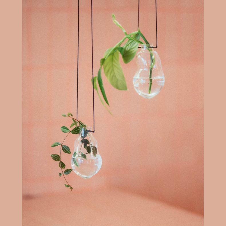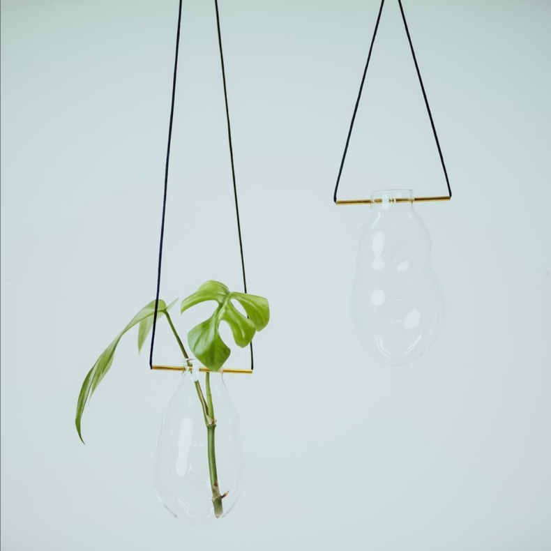 Skleněné závěsné vázičky ze severu Čech. Ručně vyrobené z borosilikátového skla. Každý kousek je tak trochu jiný a originální. Výška skleněné části cca 15 cm.