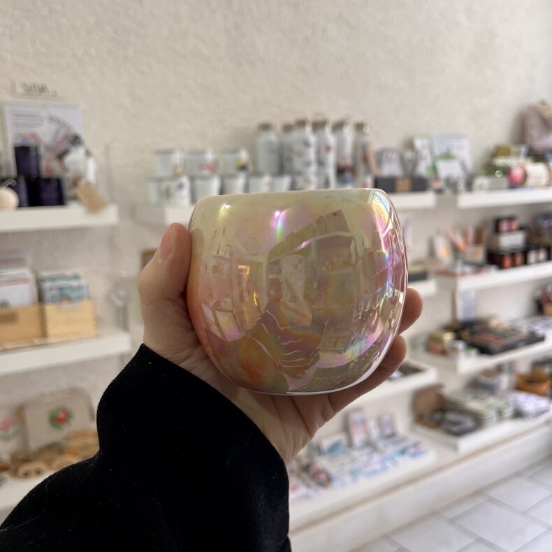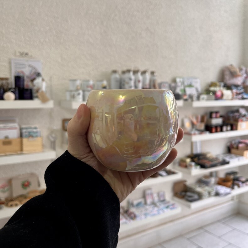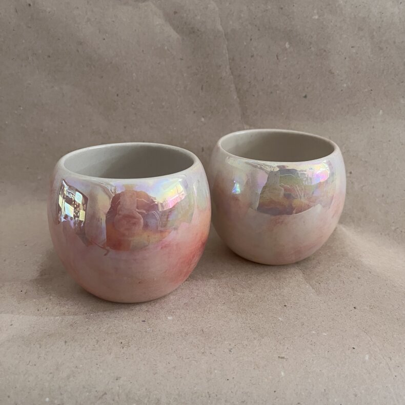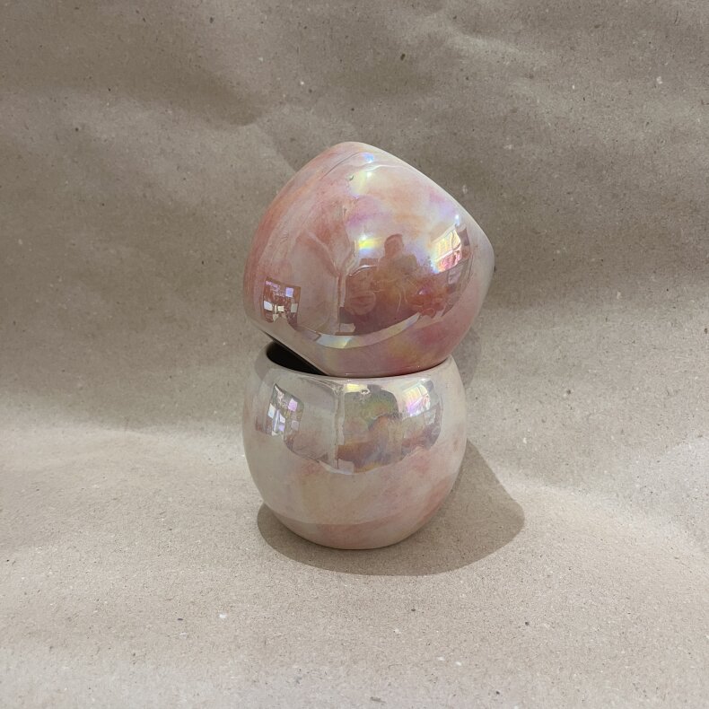 Kalíšek ze světlé kameniny s perleťovým efektem.