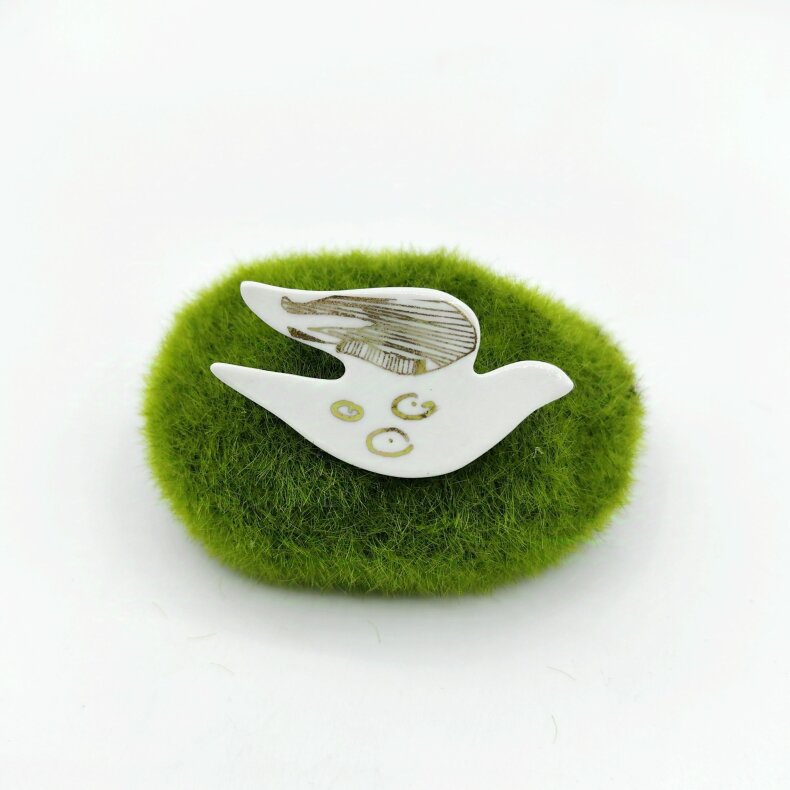 Porcelánová brož zdobená zlatým motivem na přichycení z chirurgické oceli.
