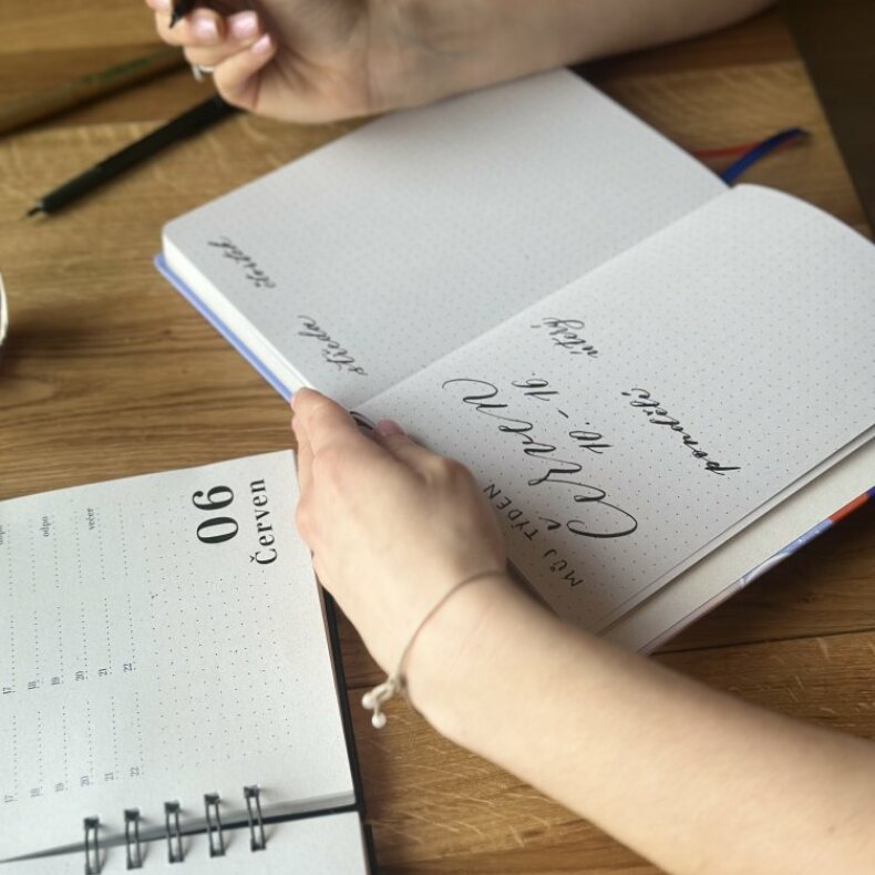 Stránky Be Nice Bullet journalu snesou opravdu hodně - akvarel, kvaš, fixy i brush peny. Doporučujeme nepoužívat brush peny na alkoholové bázi, které mají obecně tendenci papír propíjet (i ten co není recyklovaný).