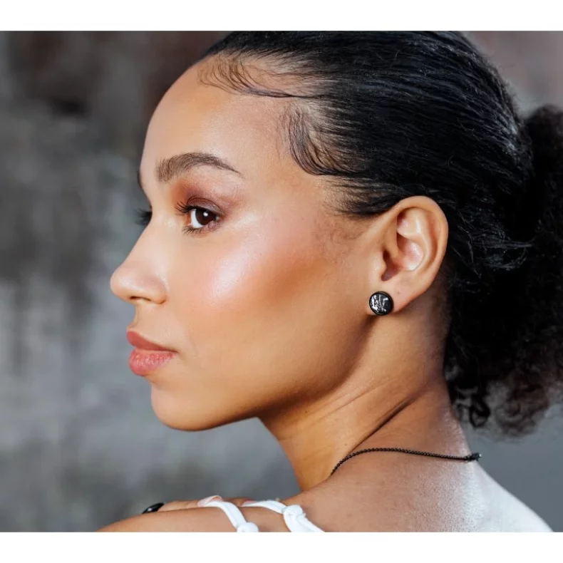 Náušnice s průměrem lůžka 12 mm, v černém provedení s černobílým designem, vyráběné ze speciálního šperkařského betonu a nerezového lůžka, jsou povrchově impregnované, a tudíž odolné proti vodě.