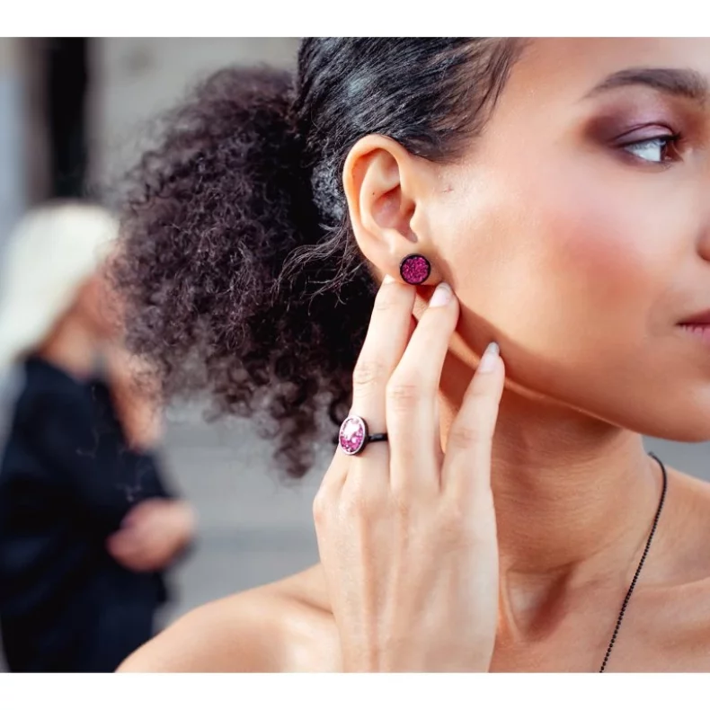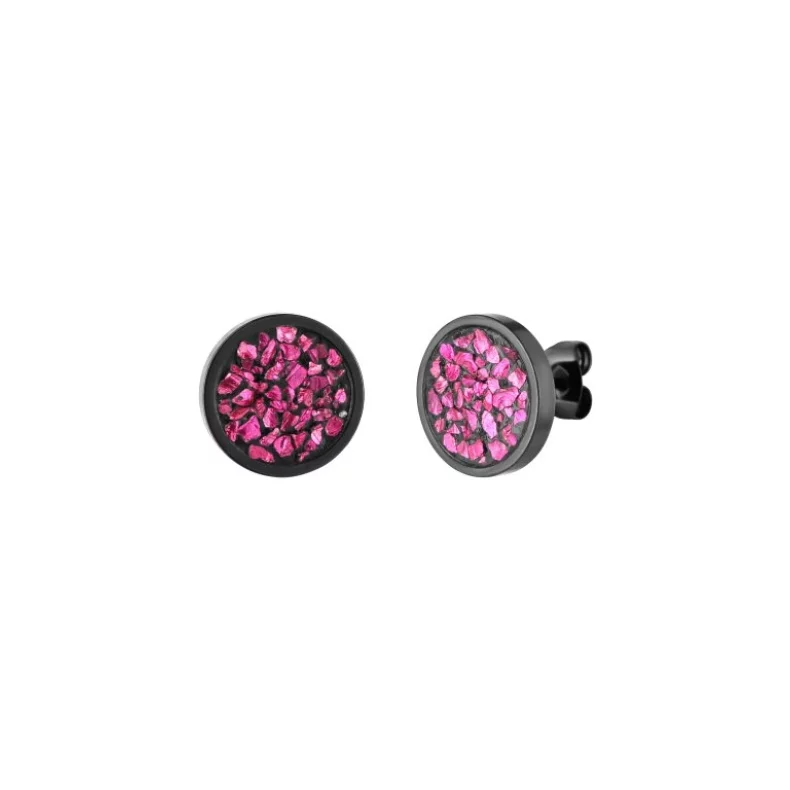 Náušnice s průměrem lůžka 12 mm, v černém provedení s růžovým designem, vyráběné ze speciálního šperkařského betonu a nerezového lůžka, jsou povrchově impregnované, a tudíž odolné proti vodě.