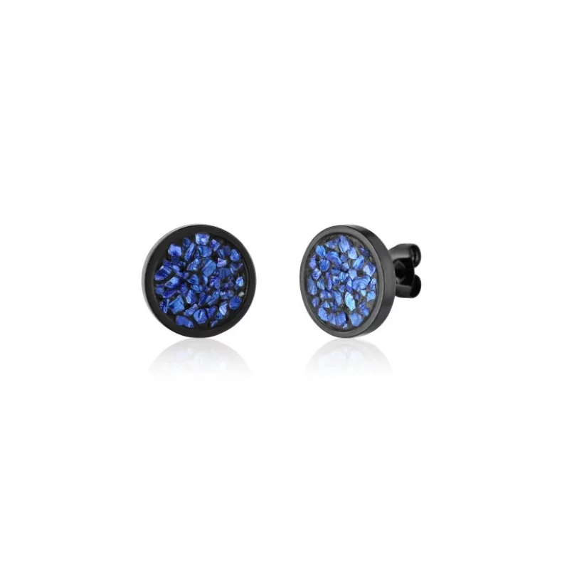 Náušnice s průměrem lůžka 12 mm, v černém provedení s modrým designem, vyráběné ze speciálního šperkařského betonu a nerezového lůžka, jsou povrchově impregnované, a tudíž odolné proti vodě.