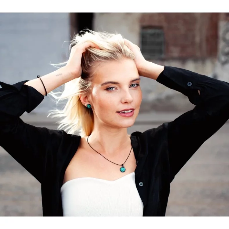 Náhrdelník je kombinací šperkařského betonu zasazeného v základu a řetízku z oceli 304, zelené provedení. Přívěšek má průměr 2 cm.
