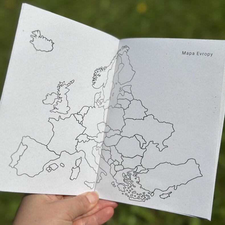 Na předních stranách naleznete mapu České republiky, mapu Evropy a mapu světa.