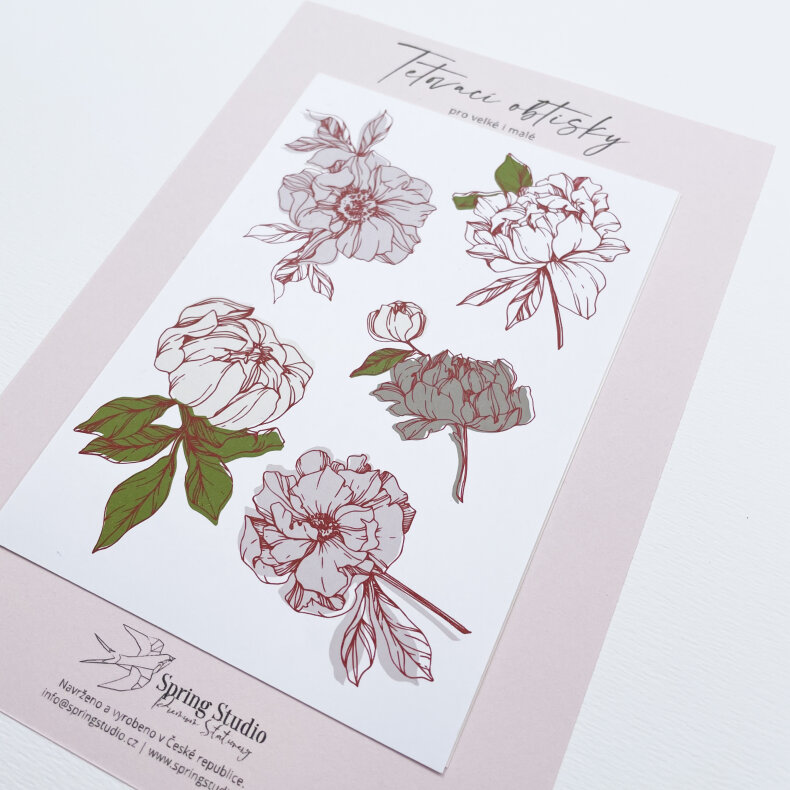 Květinové jarní obtisky na nesavé a pevné materiály. Třeba na velikonoční vajíčka. Aplikace pomocí vody na nesavé, pevné materiály.