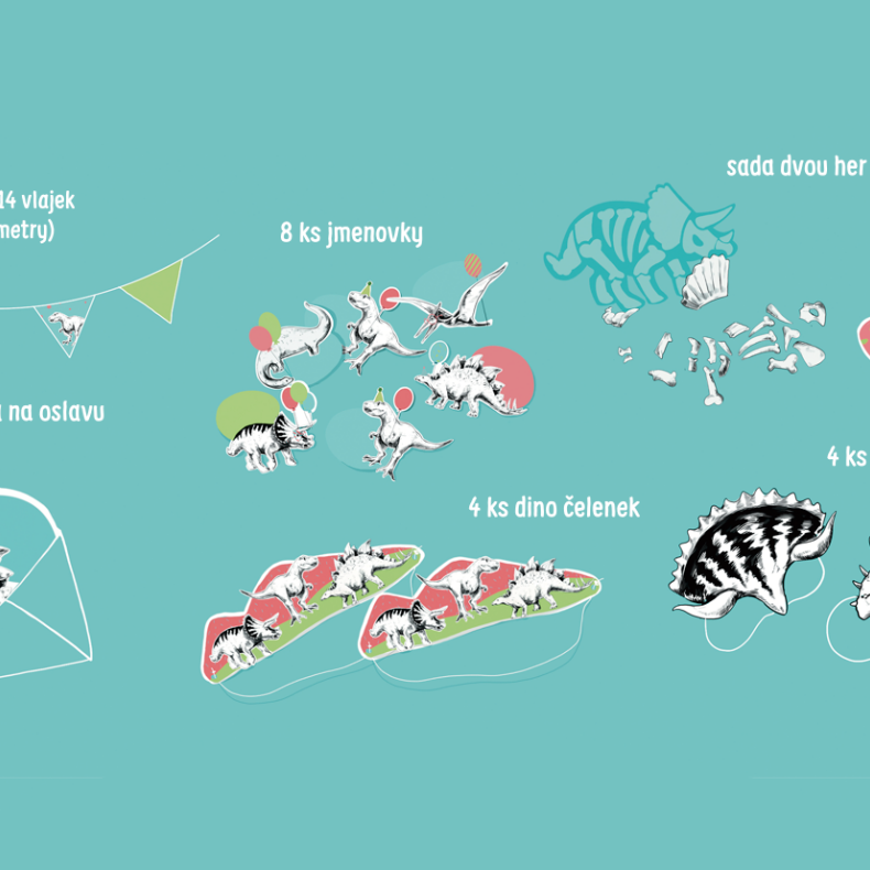 Sada obsahuje: girlanda 14 vlajek, 8 ks jmenovky na kelímky, sada dvou party her, 4 ks masek k dotvoření, 4 ks hotových masek, 8 ks pozvánek na oslavu.