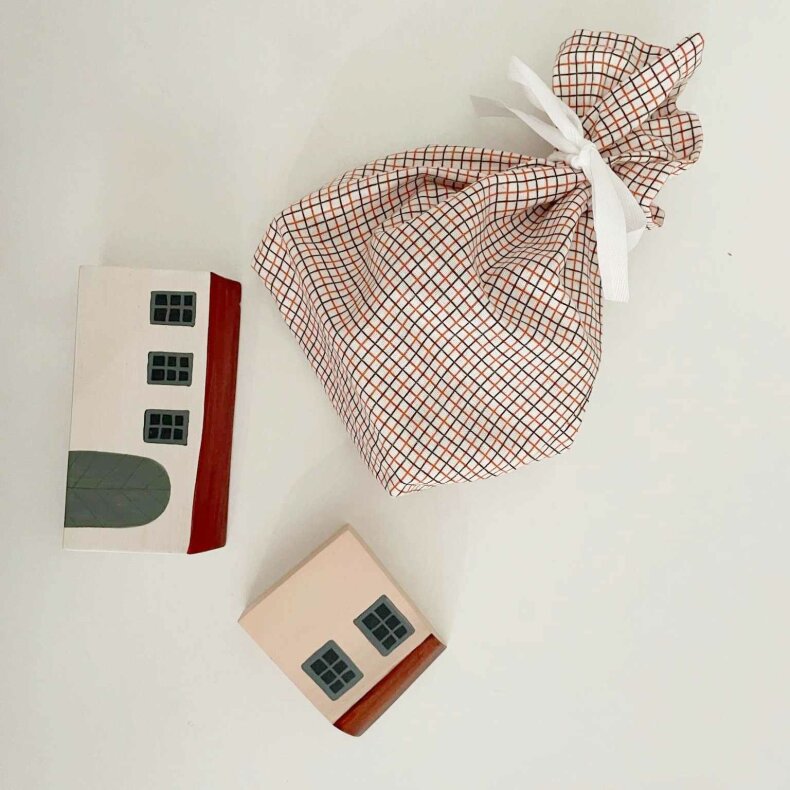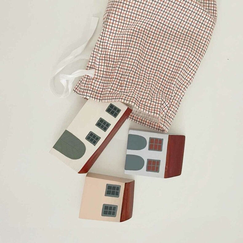Rozměry tašky jsou 16 x 19 cm, rozměry domečků jsou různé. Domečky jsou vyřezané z lipového dřeva, ručně malovaná akrylovými barvami a voskem, zdravotně nezávadná.