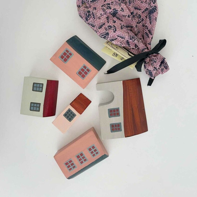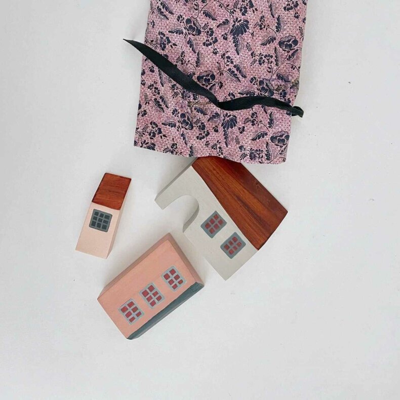 Rozměry tašky jsou 16 x 19 cm, rozměry domečků jsou různé. Domečky jsou vyřezané z lipového dřeva, ručně malovaná akrylovými barvami a voskem, zdravotně nezávadná.