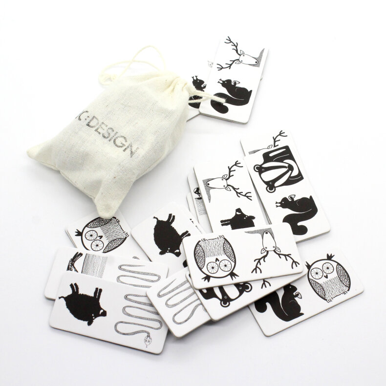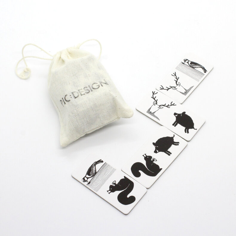 Balení obsahuje 21 černobílých hracích karet s motivem jezevce, veverky, strakapouda, jelena, kance, sovy a hada. Karty jsou tištěny na kvalitním otíratelném kartonu, velikost jedné karty je 3 cm x 6 cm x 1,7 mm. Domino je ideální na cesty, protože je zabaleno ve stahovacím lněném pytlíku.
