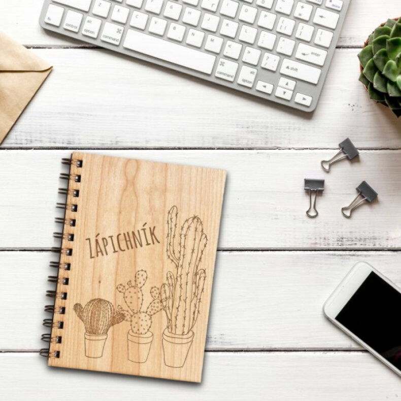 Ručně vyráběný dřevěný blok v kombinaci s laserovým gravírováním. Na místech barevných detailů je dřevo vylaserováno skrz, aby prosvítala úvodní barevná strana.