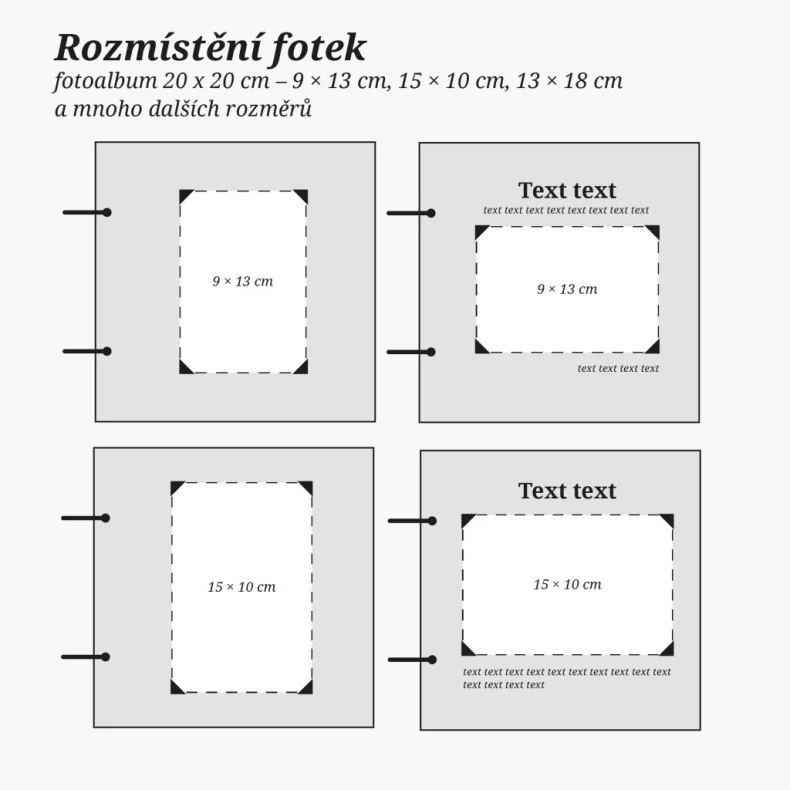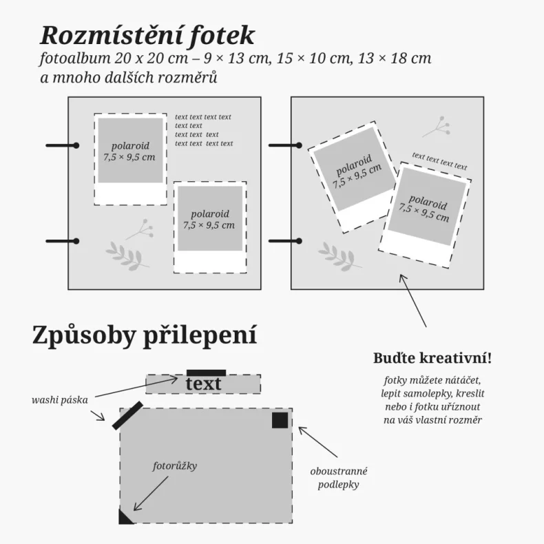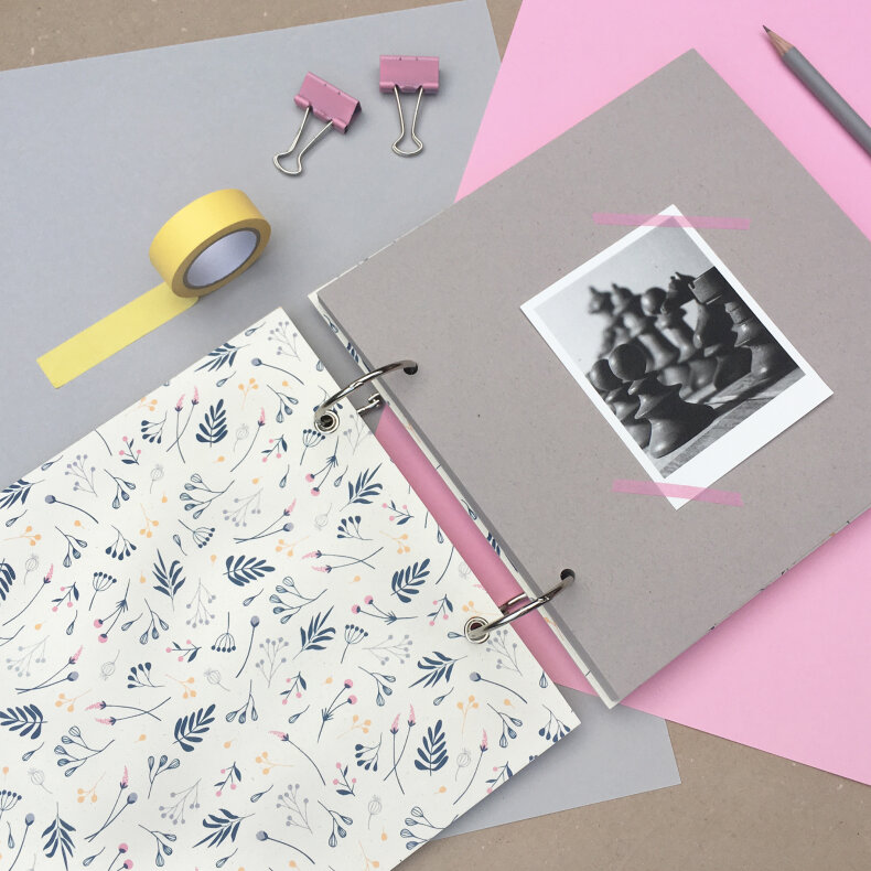 Album je svázáno kroužkovou vazbou a proti otevírání zajištěno gumičkou. Do alba si tak můžete přidávat libovolné stránky a ty co se třeba nepovedou naopak zase odebrat. Fotografie vlepíte jednoduše lepidlem, washi páskou nebo pomocí fotorožků.