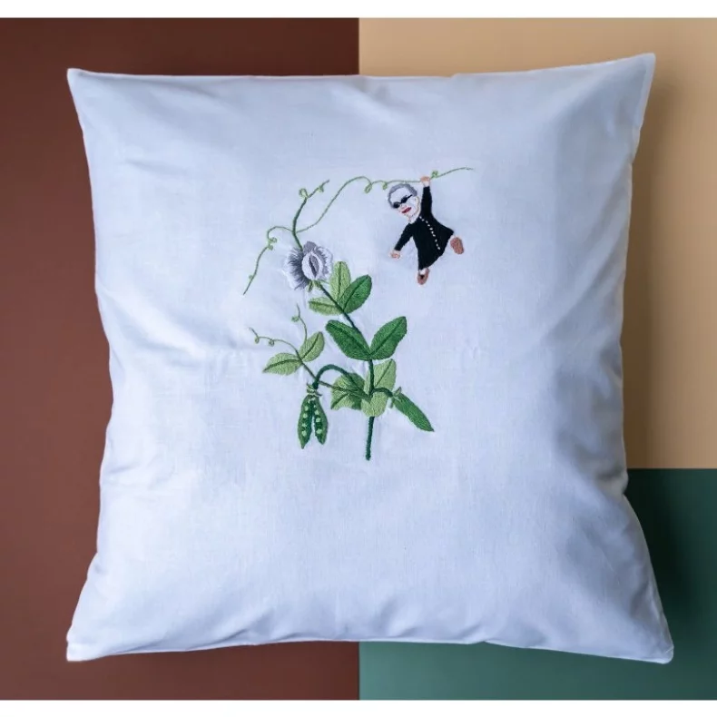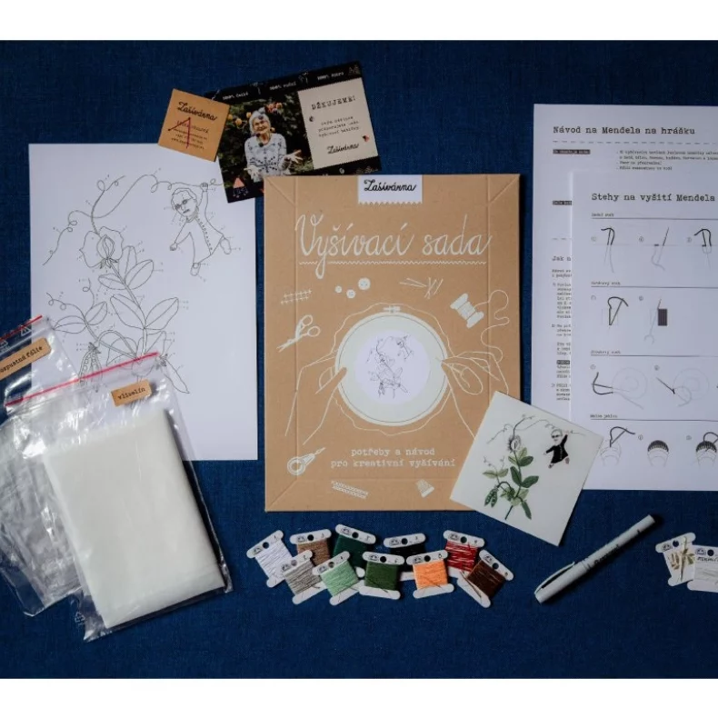 Všechno co potřebujete na vyšití obrázku s G. J. Mendelem houpajícím se na hrášku, včetně vzoru na překreslení, podrobného návodu a všech (se zvláštní péčí vybraných) 10 Perlovek.