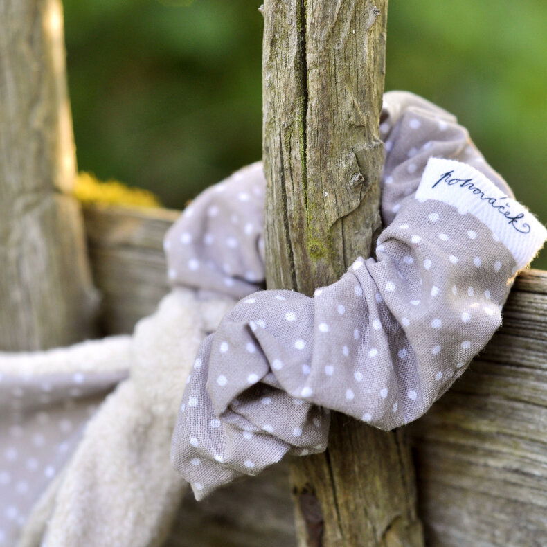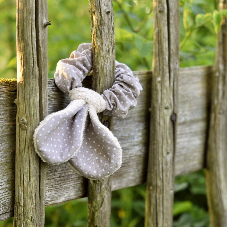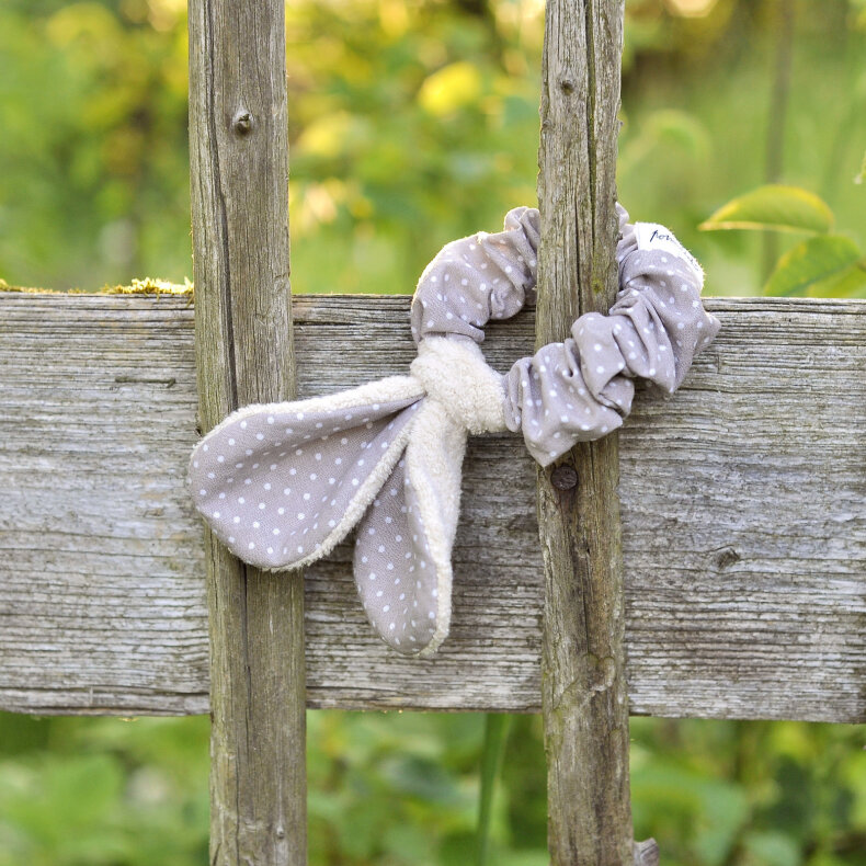 Gumička ve stylu scrunchy. Šitá z bavlněného plátna. Ouška jsou z bavlněného fleecu a plátna ve stejném vzoru jako gumička. Můžou se z gumičky odvázat, pokud nemáš ušatou náladu.