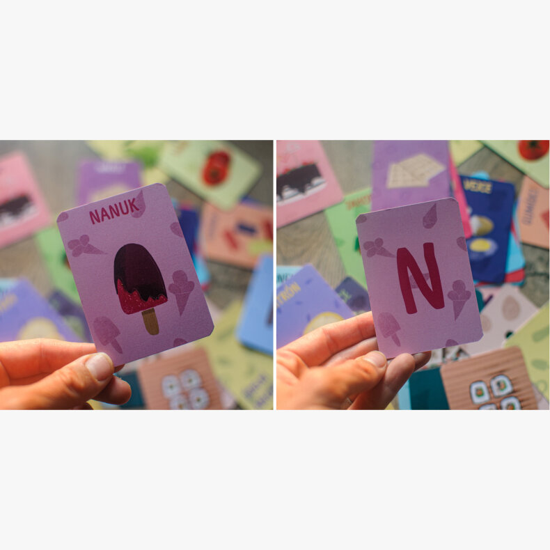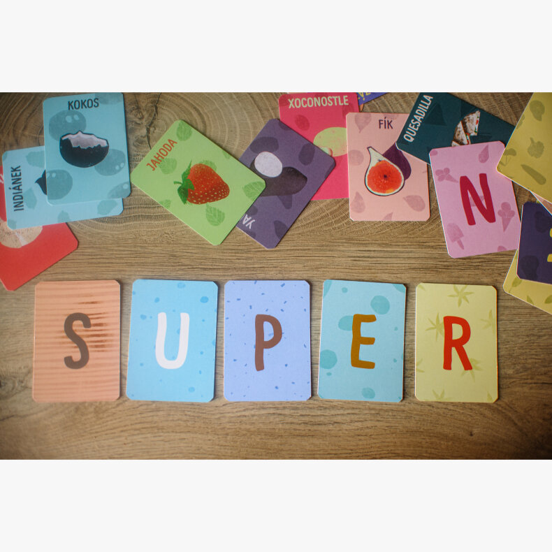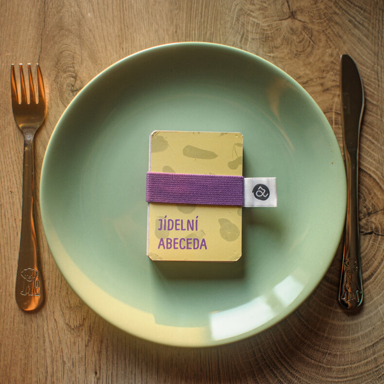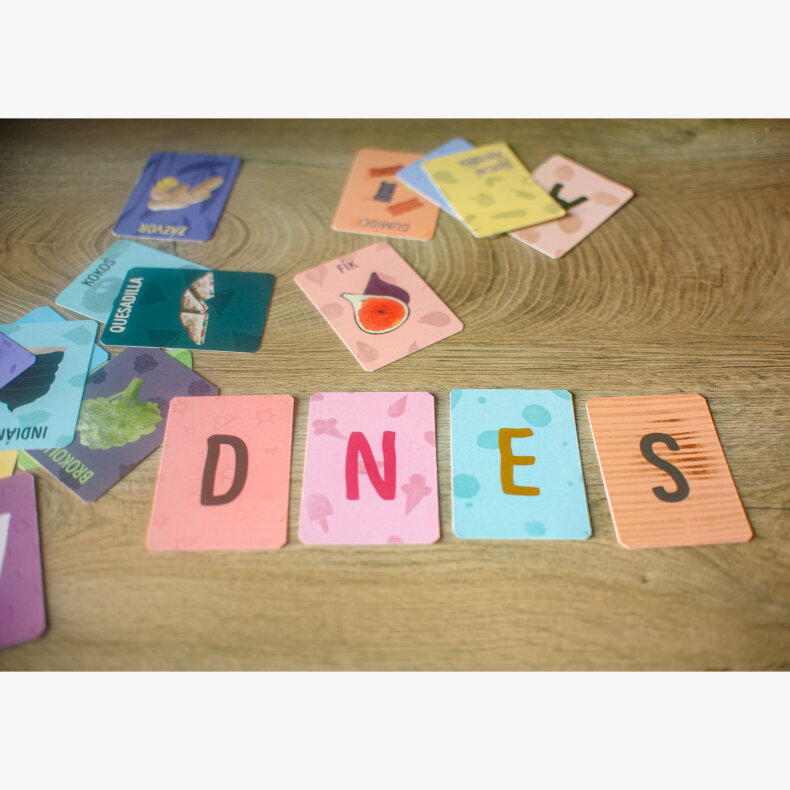 Sada 27 barevných kartiček sepnutých praktickou gumičkou v náhodných barvách (sada neobsahuje krabičku). Najdete v ní všech 27 písmen české abecedy bez diakritiky (A - Z). Písmena jsou velká tiskací. Na jedné straně karty je vždy název a obrázek potraviny, na druhé straně je velké tiskací písmeno, na které daná potravina začíná.