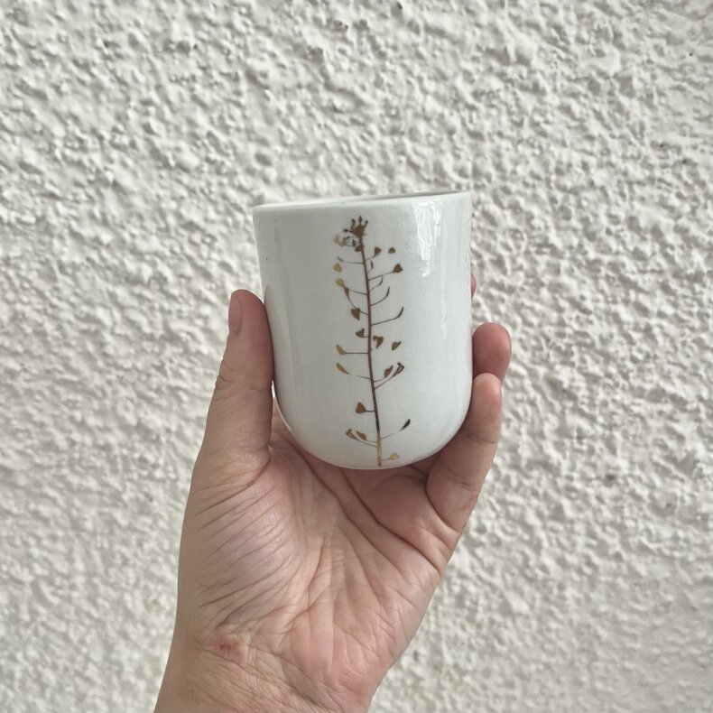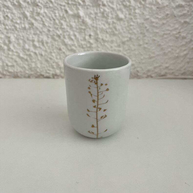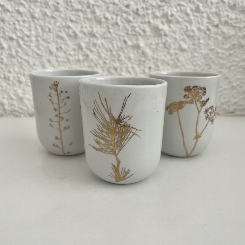 Z této kolekce pak pochází i kalíšky s dalšími zlatými motivy např. kmínu semenného či borovicového jehličí.