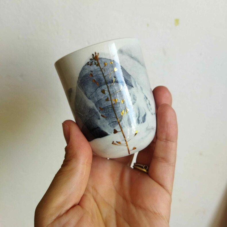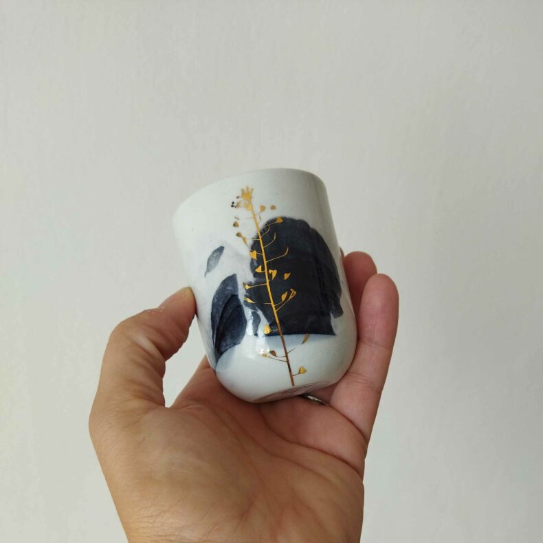 Porcelánový kalíšek probarvený černým pigmentem a dekorovaný zlatou kokoškou pálenou na třetí výpal při 750°C.