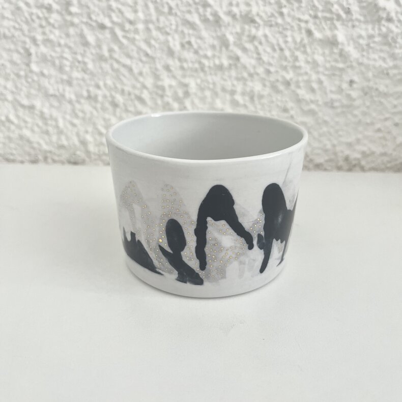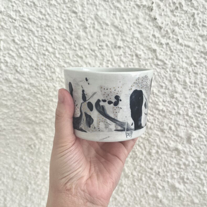 Černě podbarvený kalíšek se zlatými tečkami na chvíle, kdy malý hrneček prostě nestačí a chce to pořádně velkou porci vašeho oblíbeného nápoje.