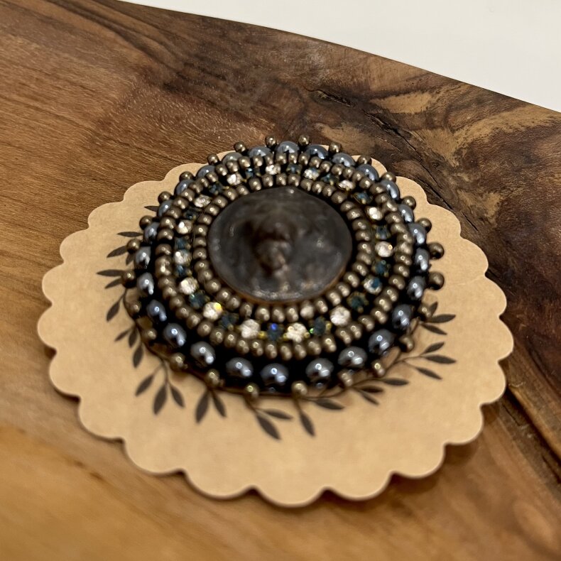 Krásná vyšívaná brož ze skleněného lehoučkého korálu a rokajlu vyšitá na filcu