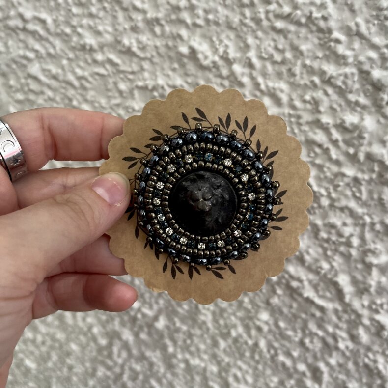 elegantní tmavě šedá brož se lvím medailonkem je kouzelným doplňkem vašeho šatníku