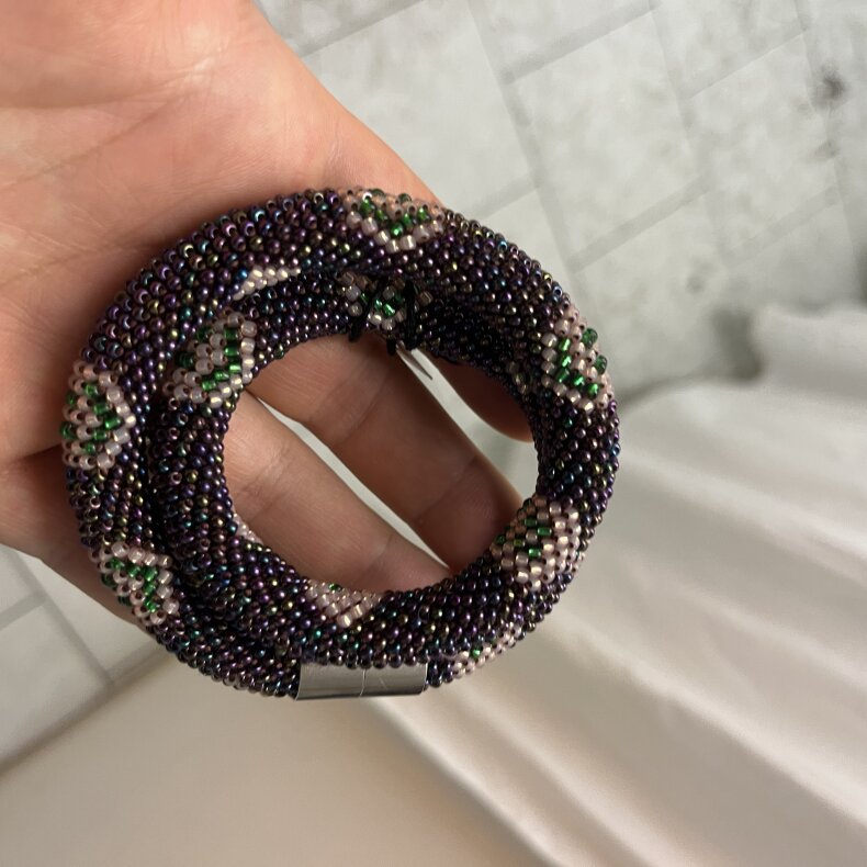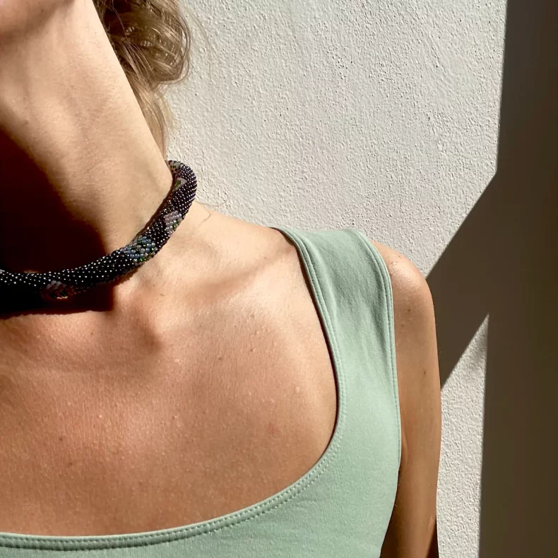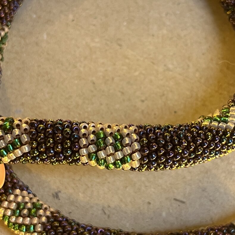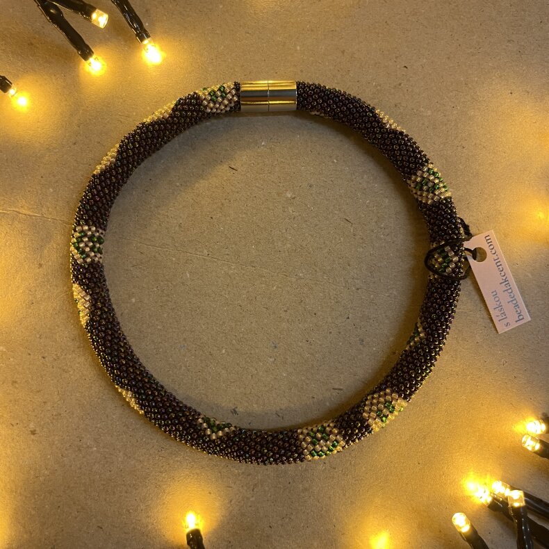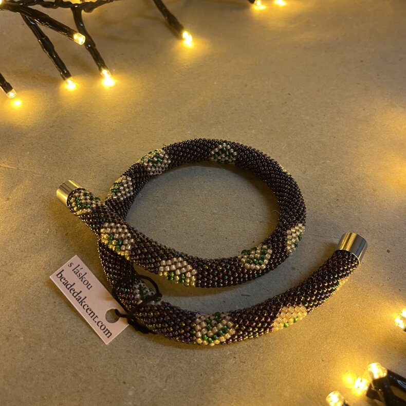 Tento náhrdelník byl vyroben s využitím korálků Preciosa a TOHO. Náhrdelník lze nosit i jako náramek nebo přívěšek na tašku. Výroba zabrala autorce 7 hodin.