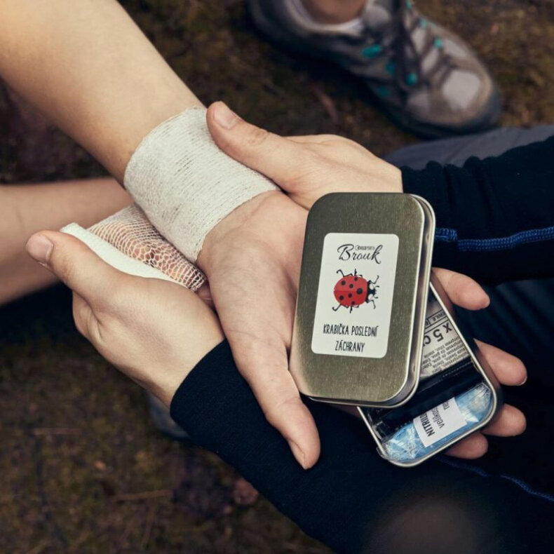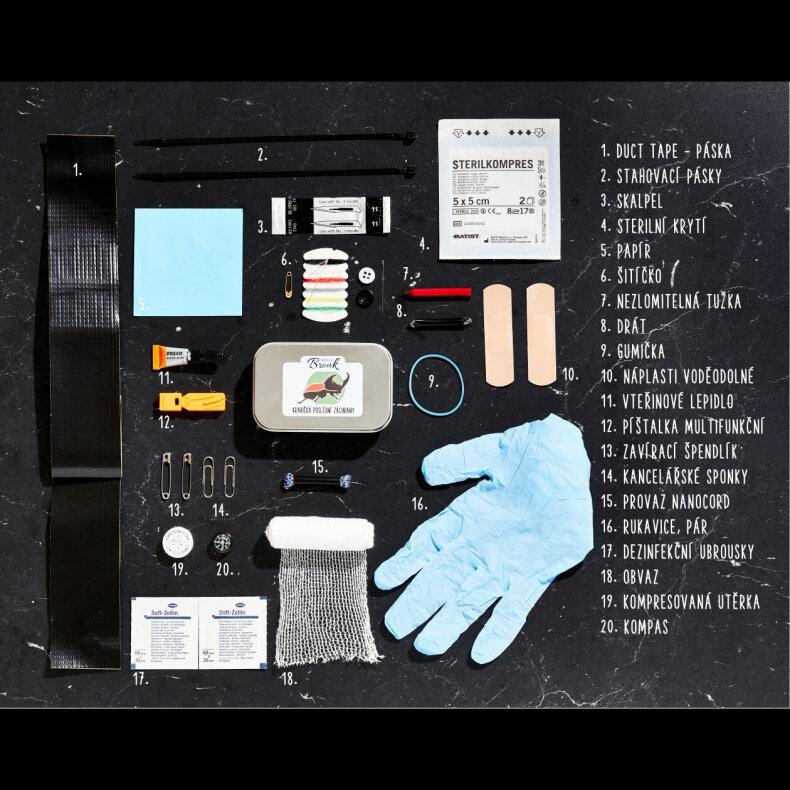 KPZ Brouk kombinuje komponenty klasické krabičky poslední záchrany a lékárničky. Naleznete zde například jeden z nejpevnějších provázků na světě, multifunkční píšťalku, kterou tiskneme na 3D tiskárně, extra pevnou lepící pásku duct tape, dále také kvalitní věci české výroby pro první pomoc jako náplasti, sterilní krytí, rukavice, vysoce kvalitní obinadlo a spoustu dalšího!