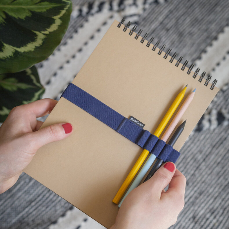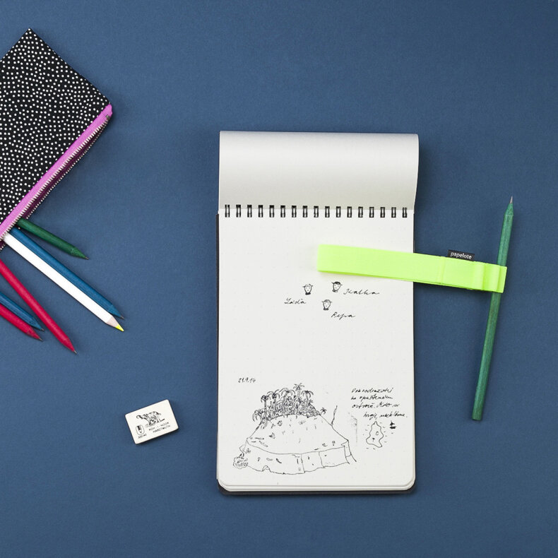 Blok na poznámky i náčrty. Pevné desky slouží jako podložka a umožňují tak psaní za jakékoliv situace. Barevná gumička udrží stránky pohromadě a pobere až pět tužek. Gumička na bloku je v různých barvách. Nechte se překvapit barevným výběrem.
