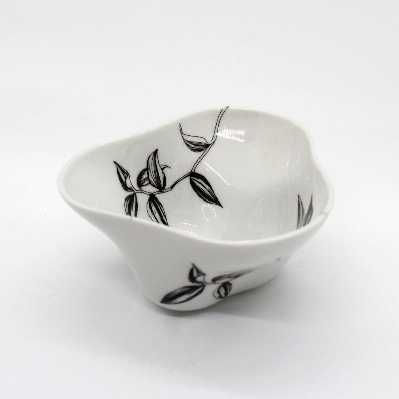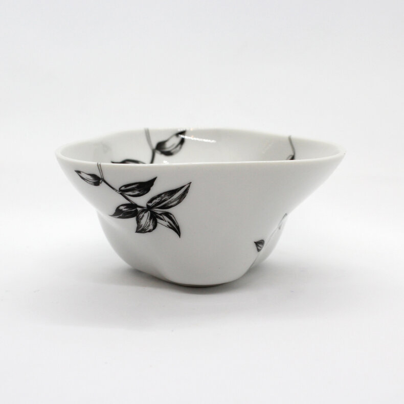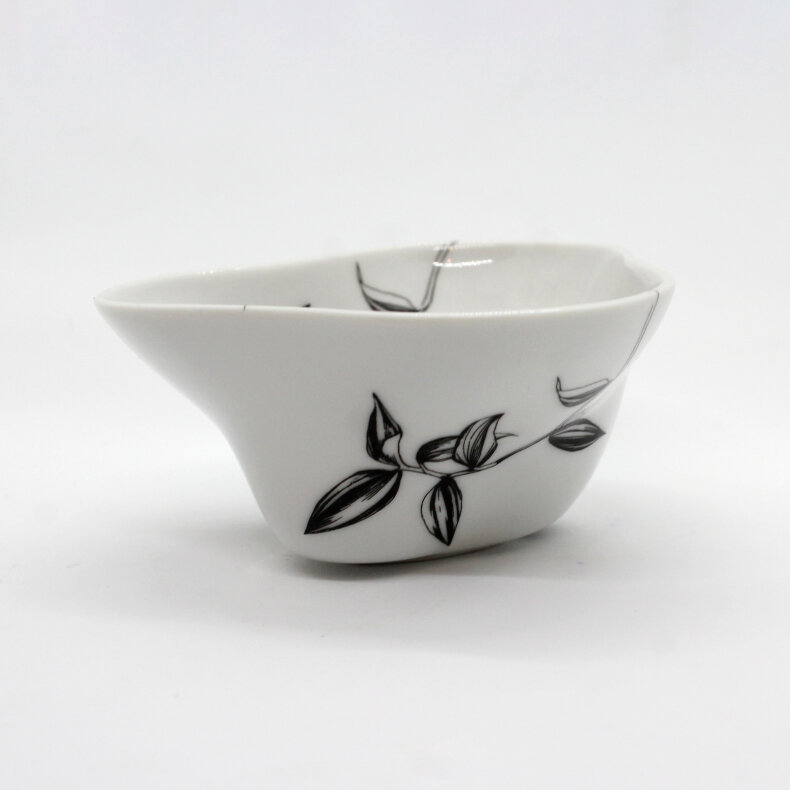 Ručně vyráběné porcelánové kousky zdobené autorskými otisky. Průměr v nejširším místě 9,5 cm, výška 4,5 cm. Lze umývat v myčce.