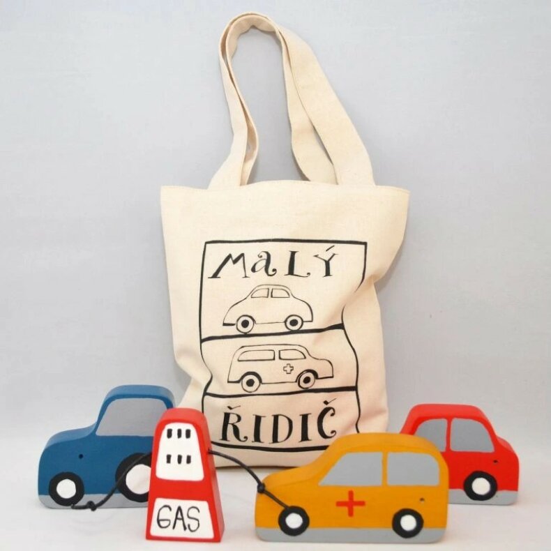 V bavlněné tašce najdete autíčka a čerpací stanici. Rozměry tašky je 20 x 24 cm. Autíčka jsou vyřezaná z lipového dřeva, ručně malovaná akrylovými barvami a voskem, zdravotně nezávadná.