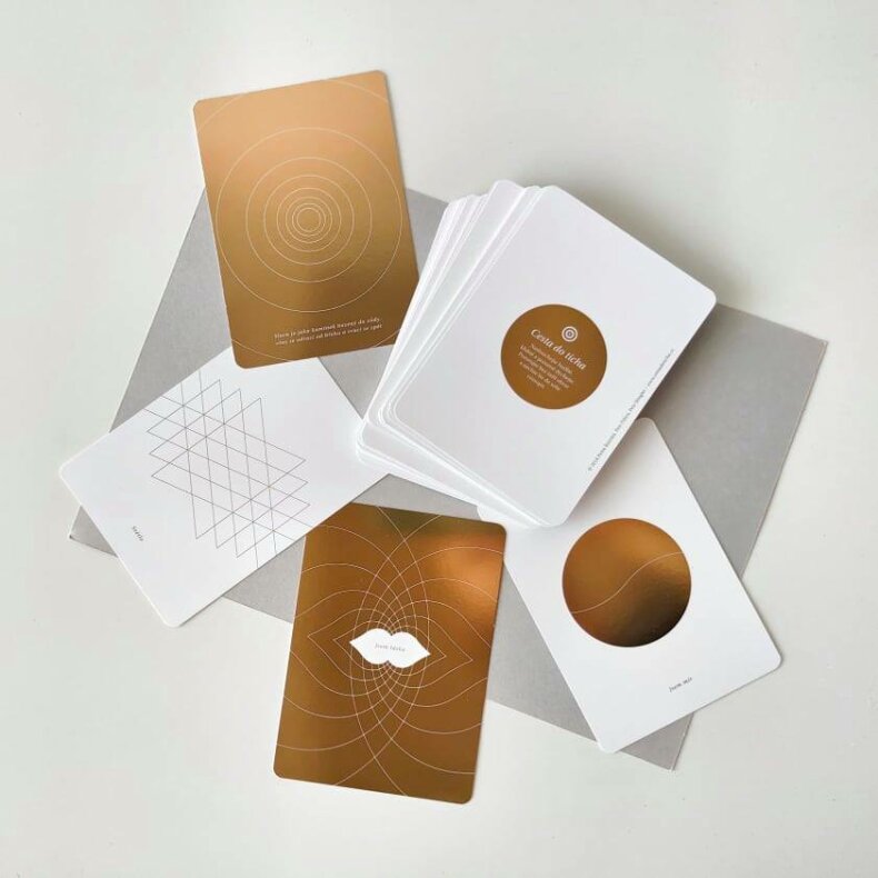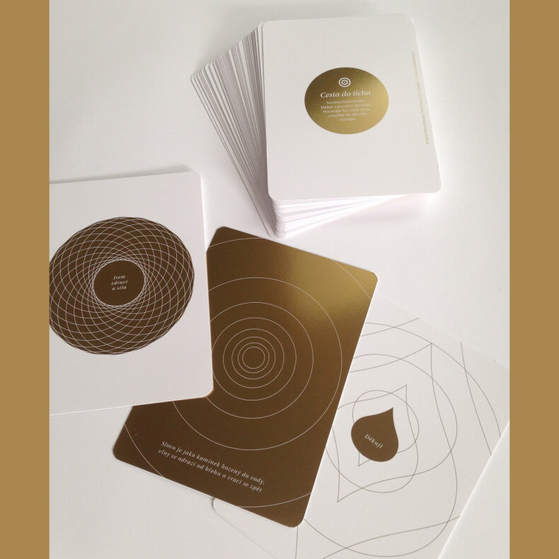 Velikost karet A6, 105 x 148 mm Tisk zlatou fólií Foilstar Vytištěno v tiskárně Grafico, s. r. o. na 250 gsm bílý křídový papír Vyrobeno v České republice