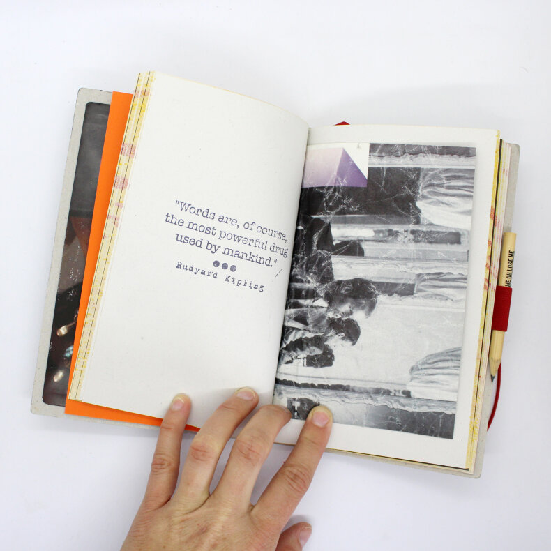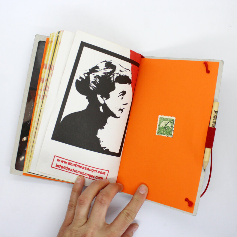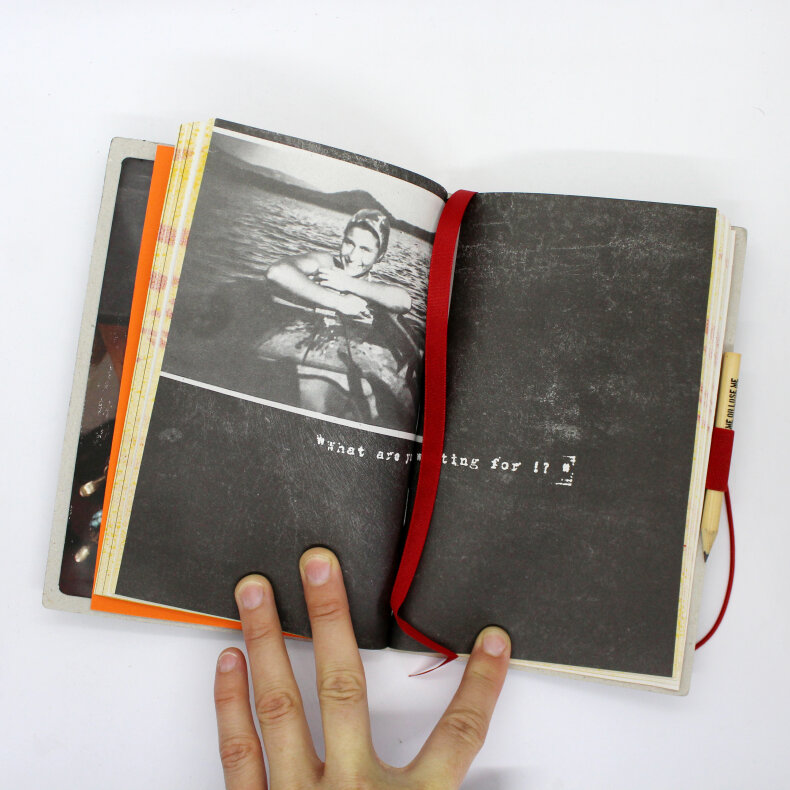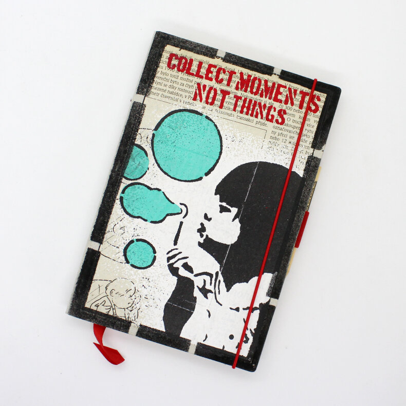 Každý zápisník je malým unikátním světem, kde staré věci dostávají nový život a prázdné stránky nabízí spoustu prostoru věcem a myšlenkám novým. Zápisník je vyroben z recyklovaného papíru. Desky z tvrdého kartonu jsou ztvárněny malým uměleckým dílem. Uvnitř najdete tužku na psaní, záložku a mezi listy bloku Vás překvapí vložené staré fotografie, pohlednice, stránky z knížek a časopisů, či použité lístky na tramvaj. Proti otevírání jsou desky zajištěny gumičkou. Vzadu je ze starých map a časopisů kapsa na drobnosti.
