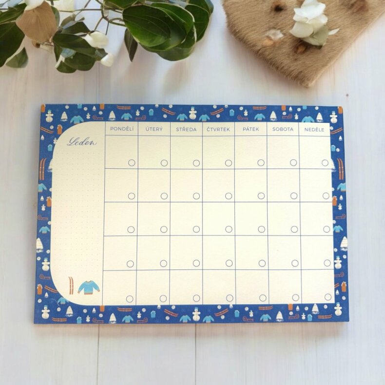 Kalendář má v každém měsíci prostor na poznámky a je rozdělen barevně do 4 ročních období.