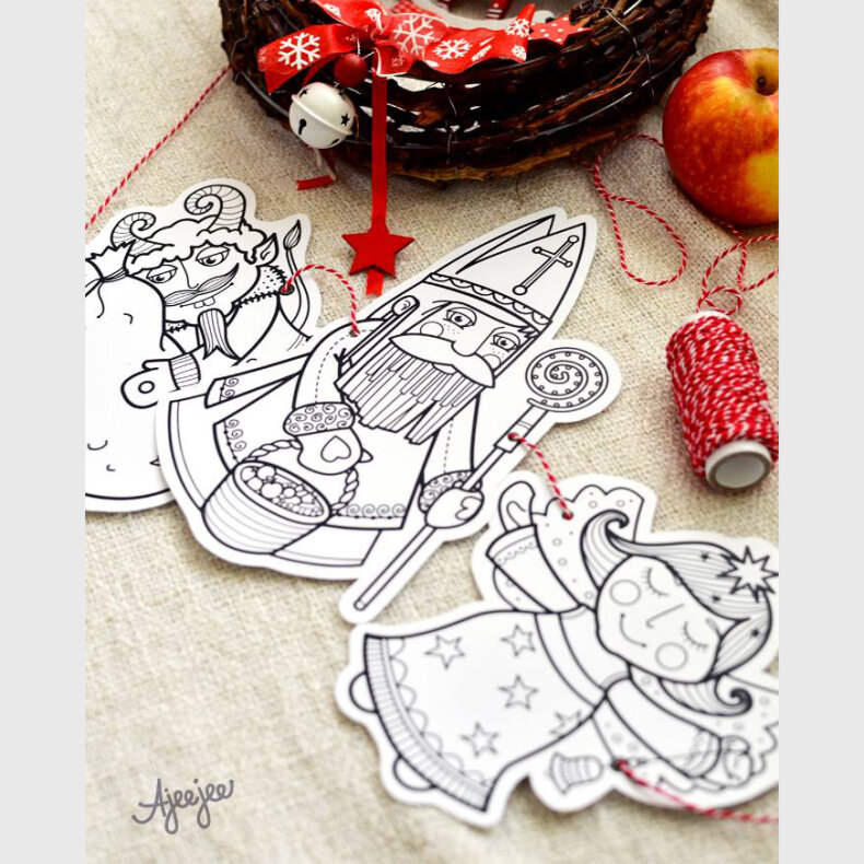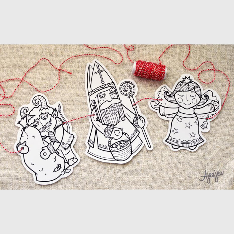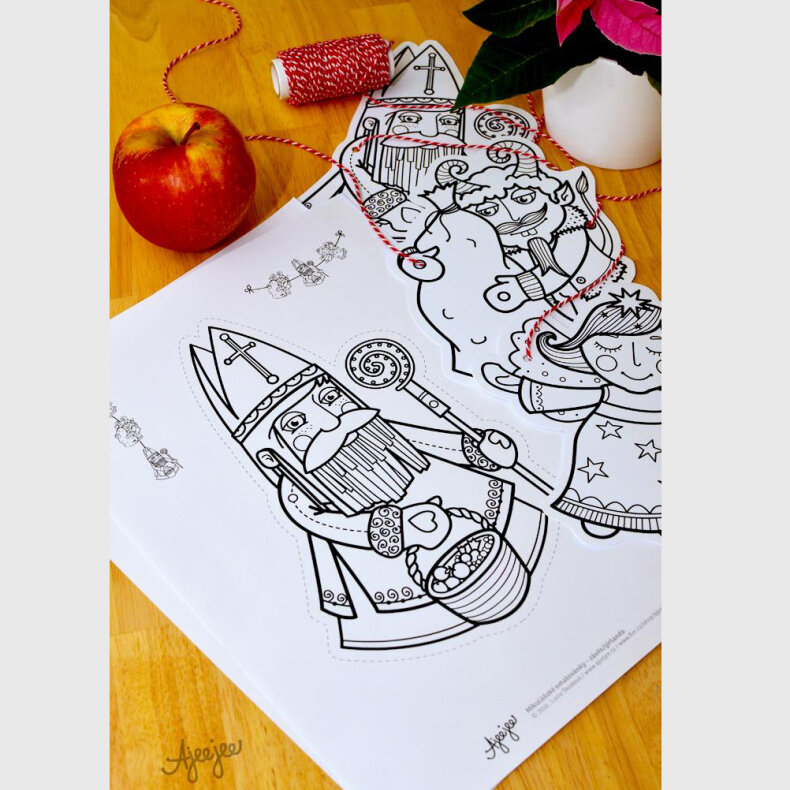 3 listy A4, 3 mikulášské postavičky. Obrázky jsou černobílé, vytištěny na silnější papír, takže se příjemně vybarvují a vystřihnuté pak poslouží jako dekorace v podobě girlandy.