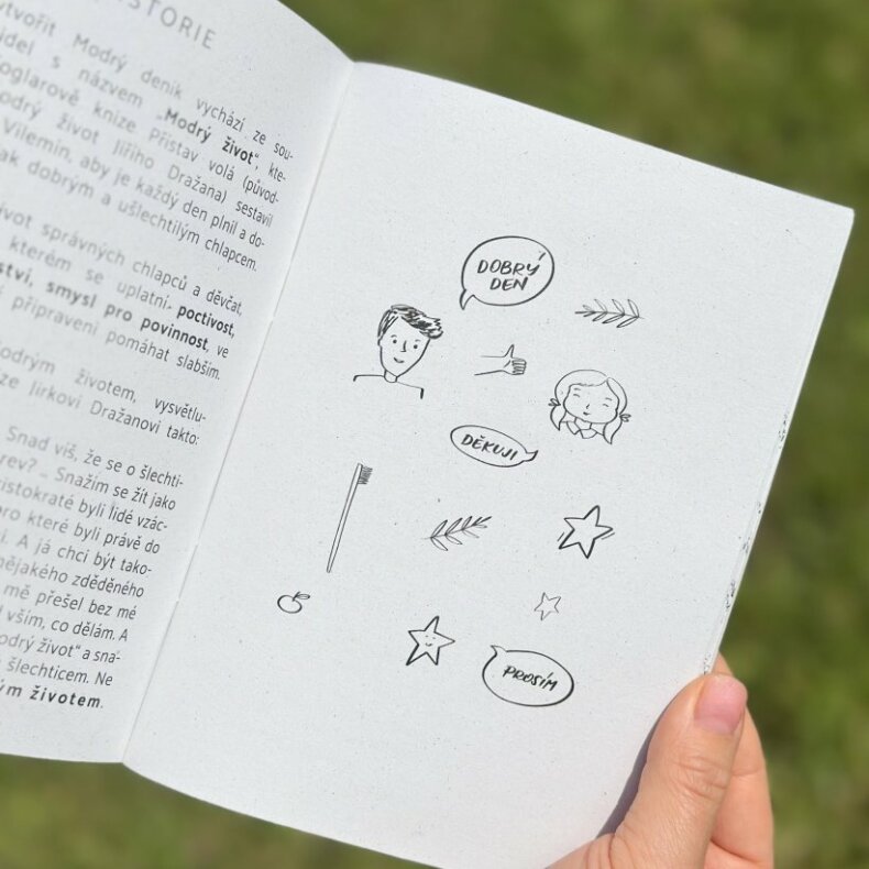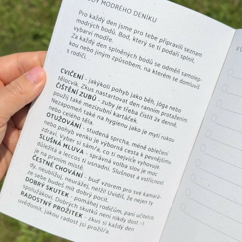Každý den budou plnit malé úkoly, pečlivě zapisovat, a odměňovat se samolepkou s modrou hvězdičkou. Deník je proložený také úkoly měsíce, za které mohou od rodičů dostávat odměny dle domluvy.