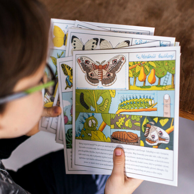 V této kreativní sadě naleznete 6 poznávacích karet k dotvoření s komiksem na zadní straně. Na kartách jsou tito motýli: lišaj smrtihlav, martináč hrušňový, otakárek fenyklový, babočka paví oko, bělásek zelný a žluťásek řešetlákový. Balení navíc obsahuje vyobrazení motýlů ve skutečné velkosti, z nichž je možné vytvořit vlastní sbírku motýlů. Vhodné pro děti od 5ti let.