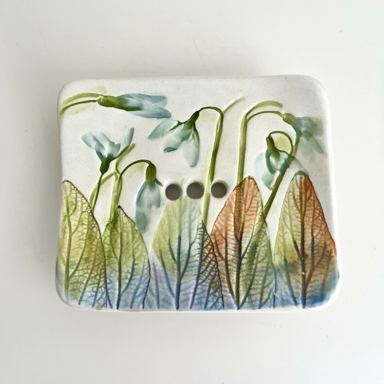 keramická mýdlenka na čtyřech nožičkách s dírkami pro odtékání pěny a vody