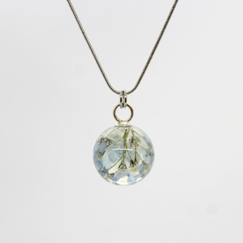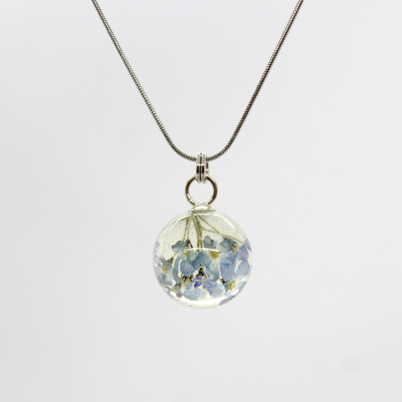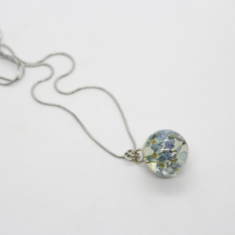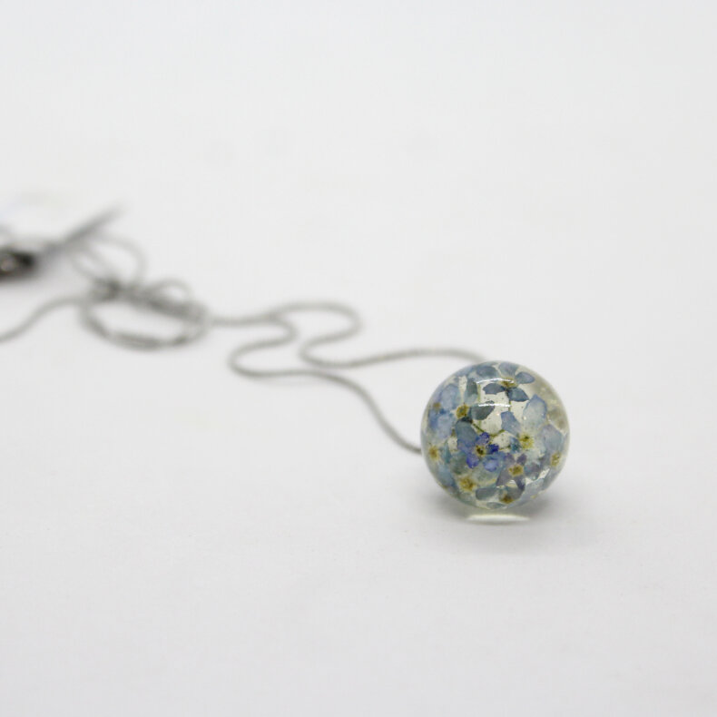 Ručně vyrobený šperk s využitím živých květů. Materiál je zalitý křišťálovou pryskyřicí. Kovové komponenty jsou z chirurgické oceli.