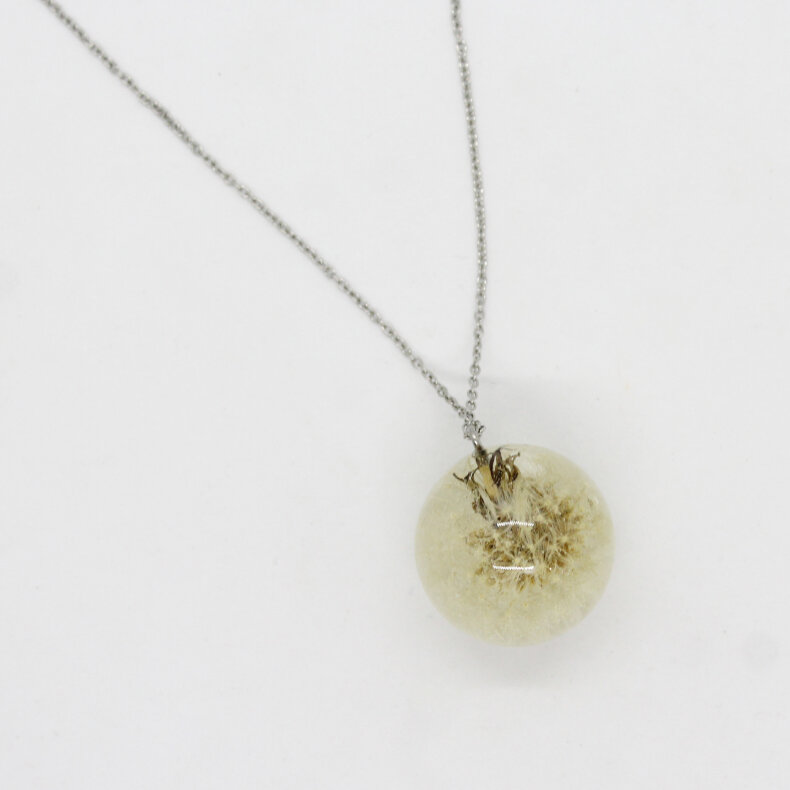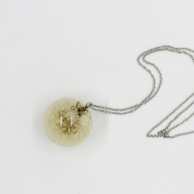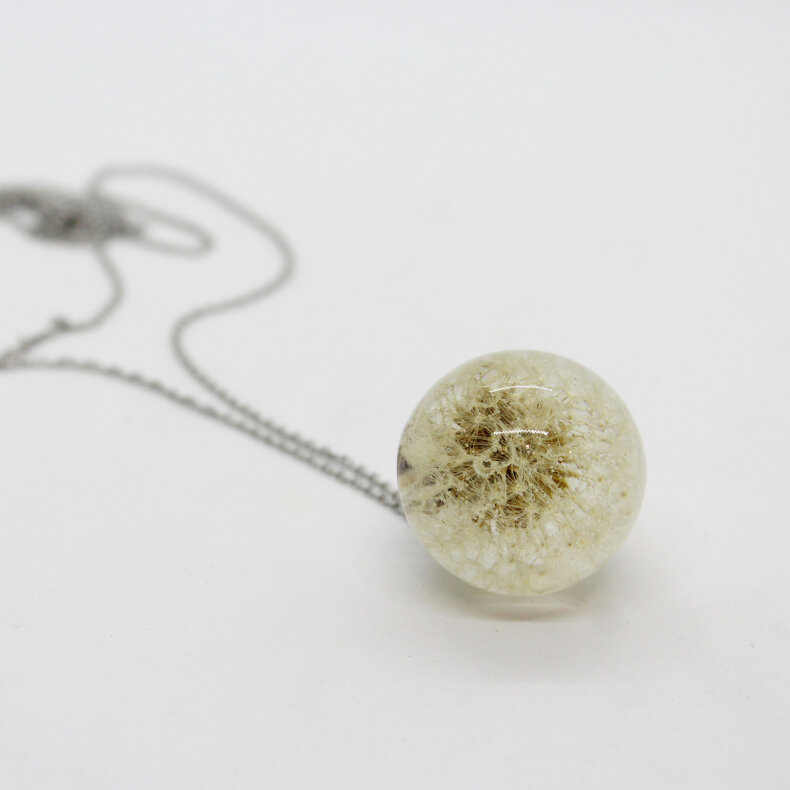 Ručně vyrobený šperk s využitím živých květů. Materiál je zalitý křišťálovou pryskyřicí. Kovové komponenty jsou z chirurgické oceli.