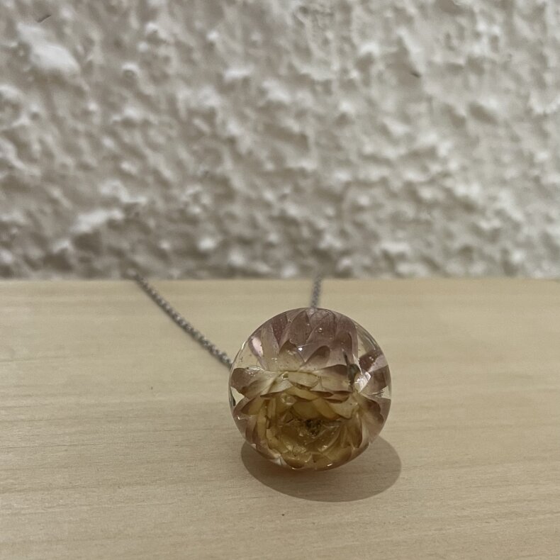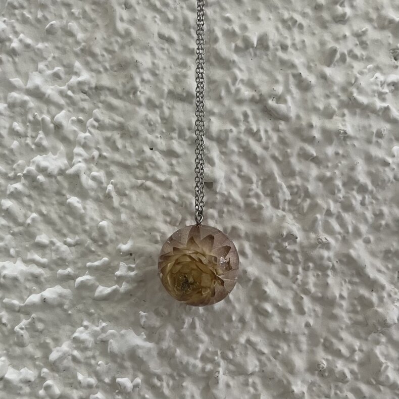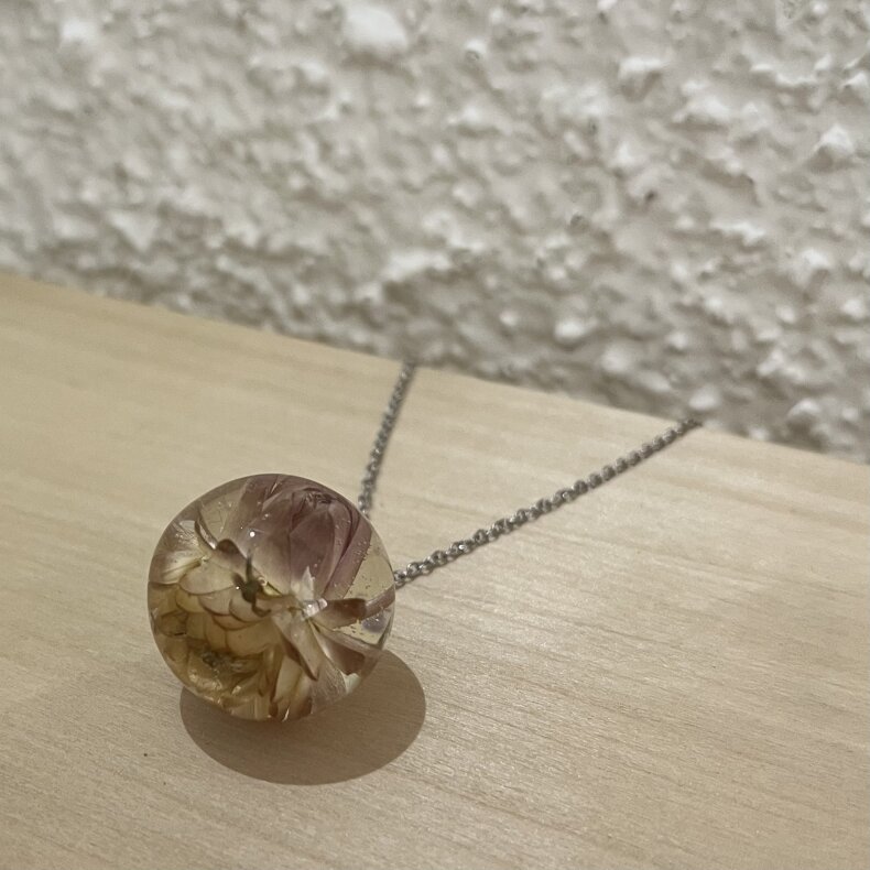 Ručně vyrobený šperk s využitím živých květů. Materiál je zalitý křišťálovou pryskyřicí. Kovové komponenty jsou z chirurgické oceli.