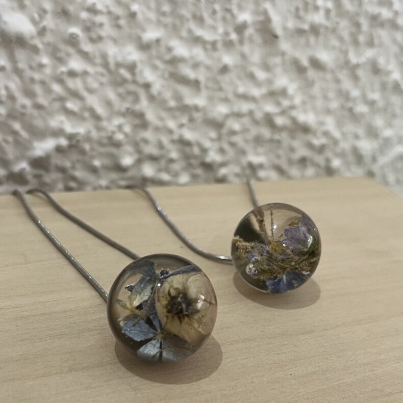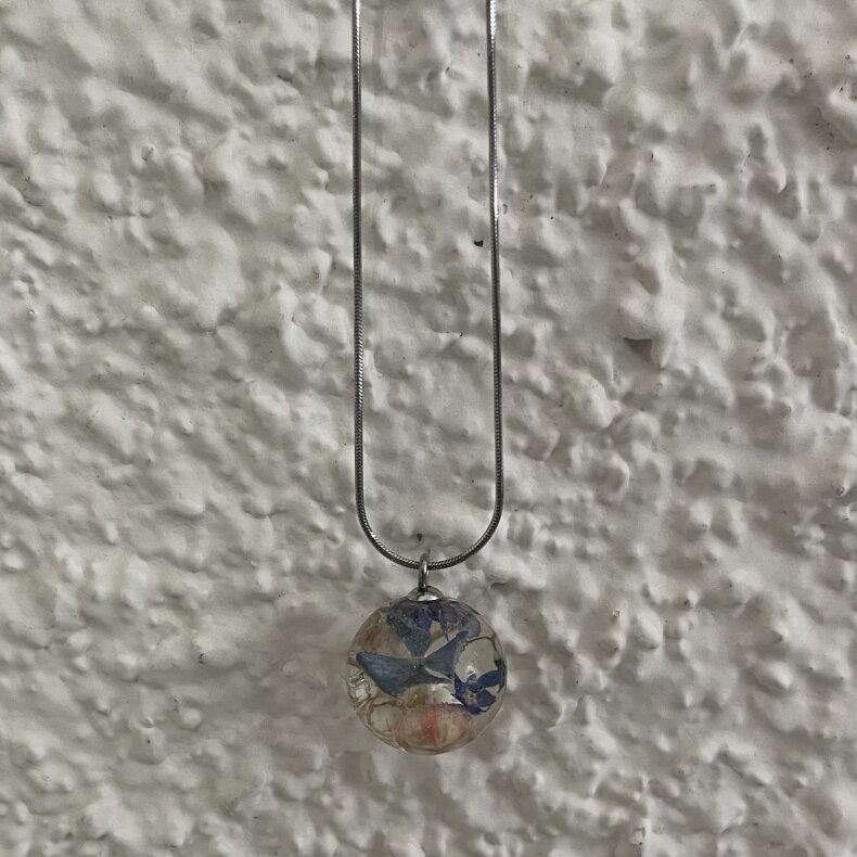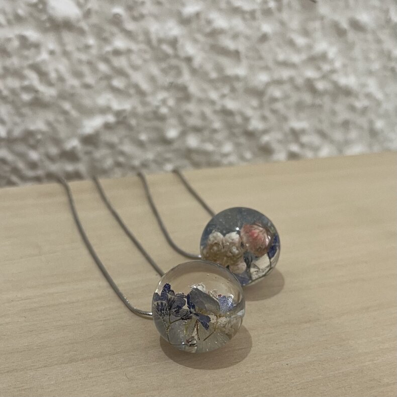 Ručně vyrobený šperk s využitím živých květů. Materiál je zalitý křišťálovou pryskyřicí. Kovové komponenty jsou z chirurgické oceli.
