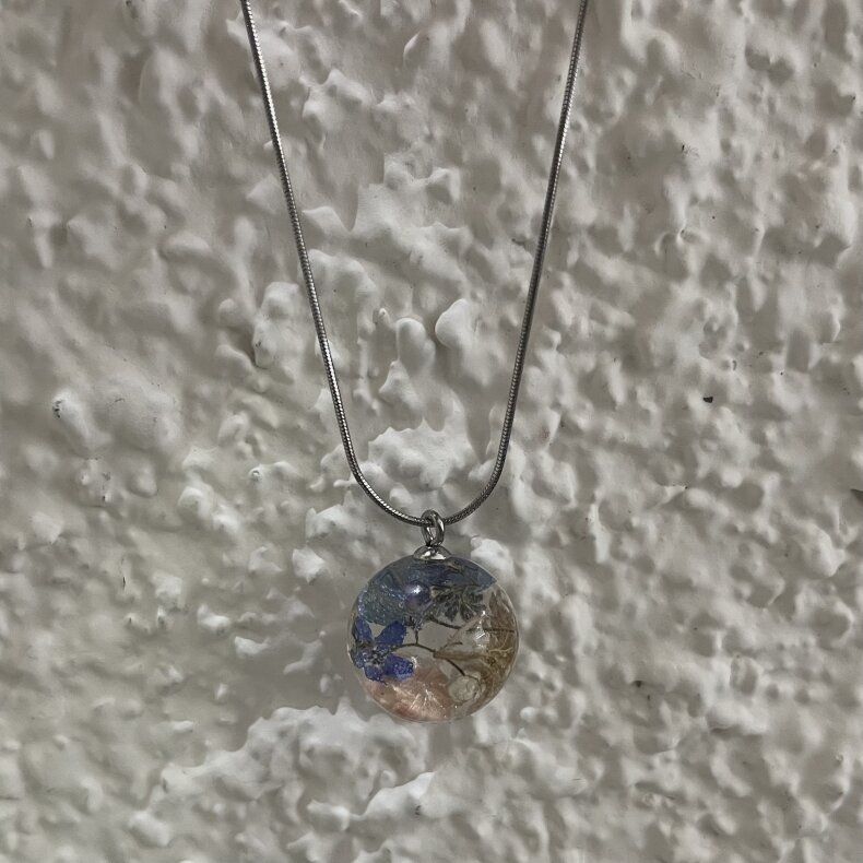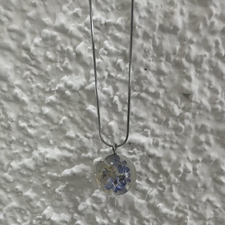 přírodní náhrdelník, v němž je zalitá kombinace hortenzie, ozothamnus a pomněnka
