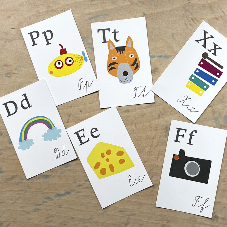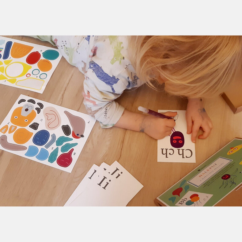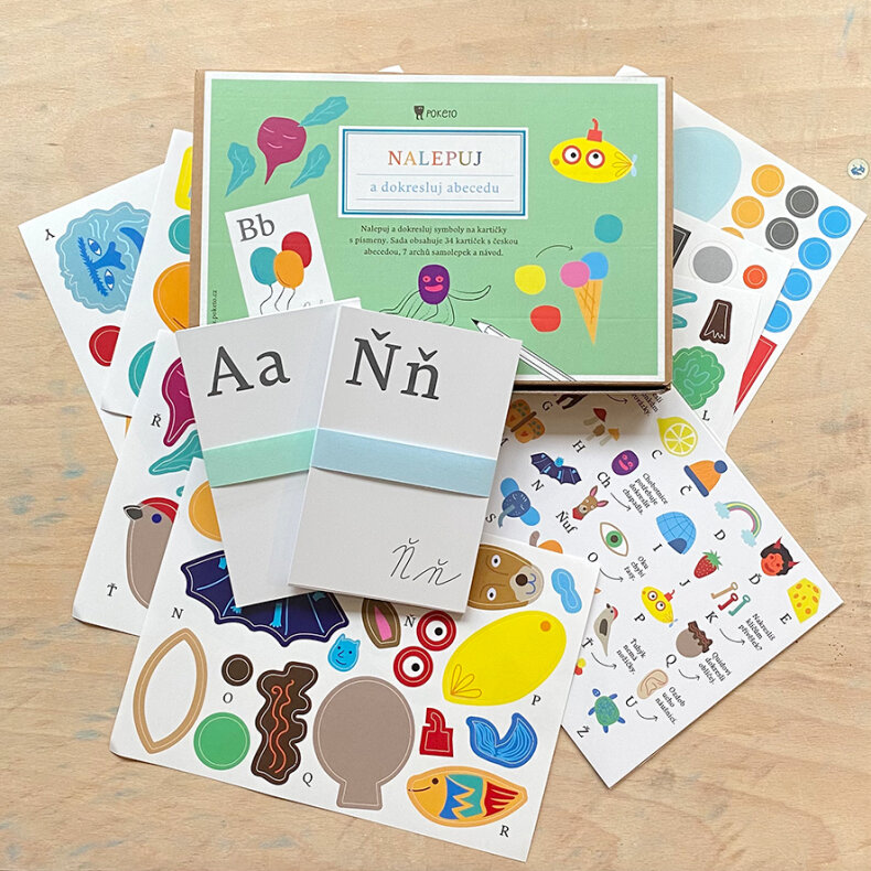 Na každé kartičce je jedno písmenko. Ke každému písmenku patří mozaika samolepek a úkol. Děti se hravě naučí abecedu a zároveň rozvíjí svou kreativitu. Hotové karty s abecedou mohou děti dále využívat pro postupné hravé učení abecedy.