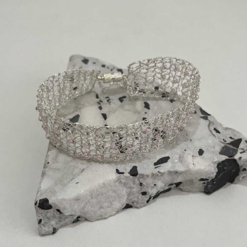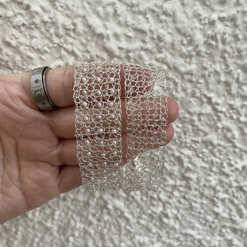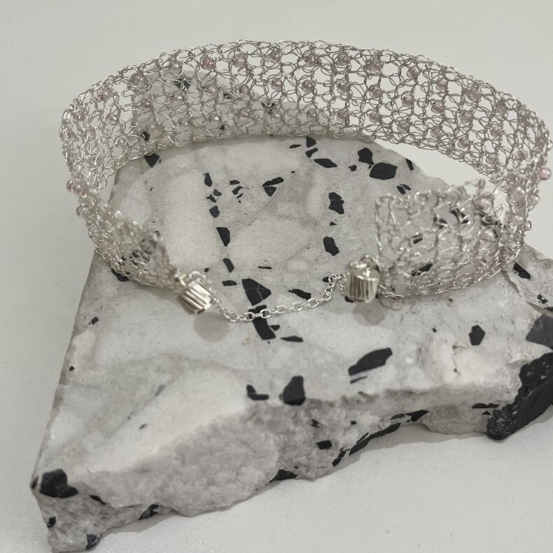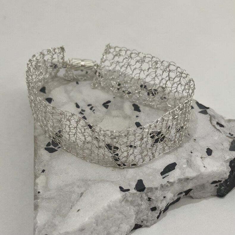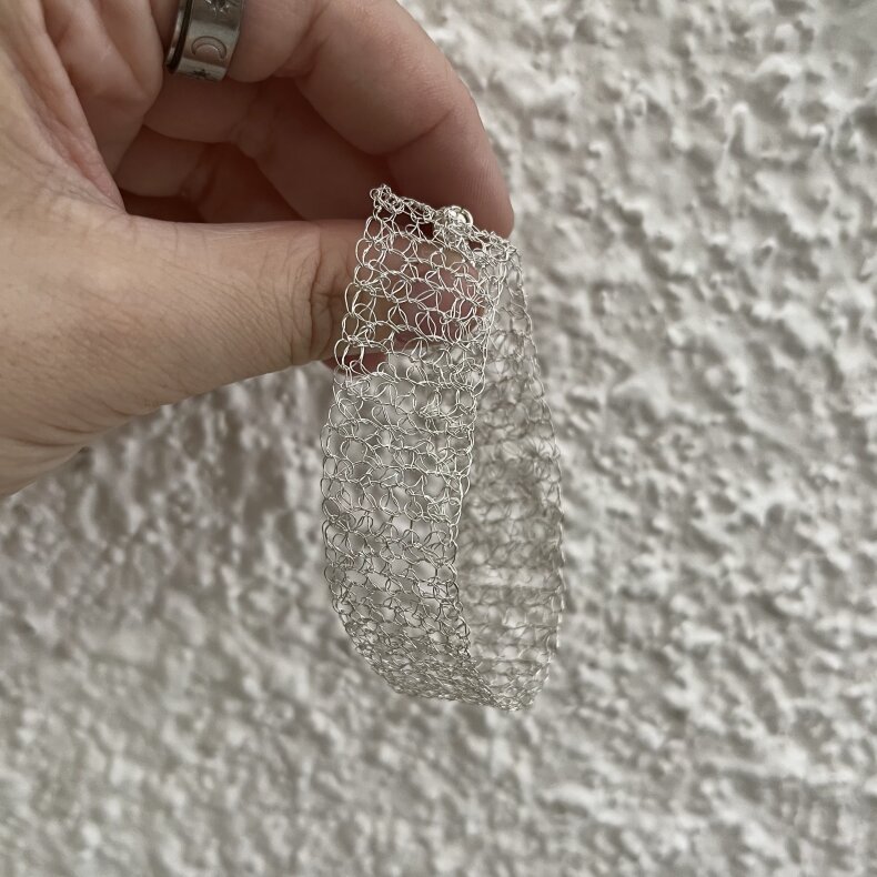 Šperky jsou tvořeny "háčkováním" drátku. Výsledek je jemný a originální zároveň. Jde o postříbřenou měď.