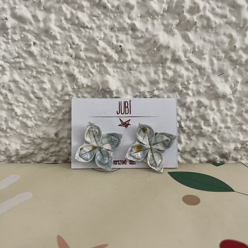 Náušnice vyrobené technikou origami v podobě kytiček se zlatými detaily.