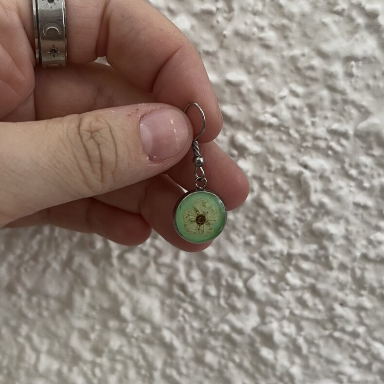 Ručně vyrobený šperk s využitím živých květů. Materiál je zalitý křišťálovou pryskyřicí. Kovové komponenty jsou z chirurgické oceli.