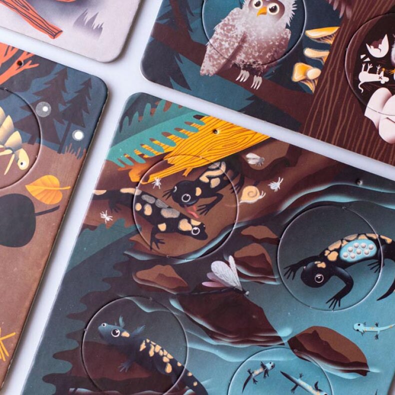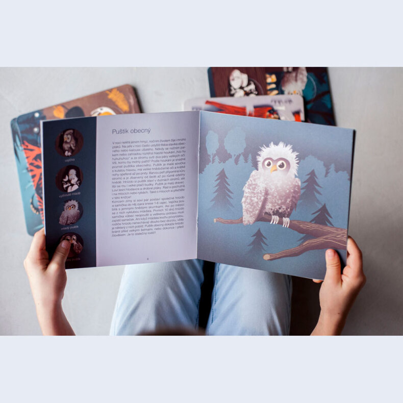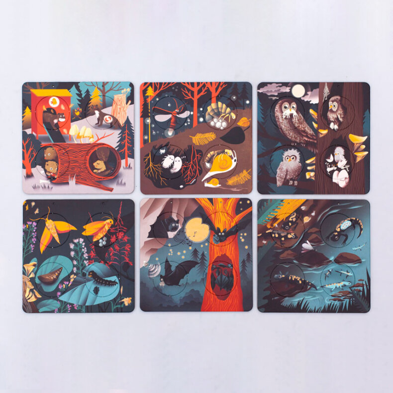 Tato interaktivní knížka přináší zajímavosti o životě 6 nočních zvířat. Své tělesné proměny vám ukáže netopýr, puštík, kuna, lišaj a světluška. Zkuste kruhové žetony sestavit tak, aby vznikl úplný obrázek vývoje zvířete. V úplné tmě vám navíc karty prozradí další malá tajemství. Karty je možné i zavěsit pomocí otvorů na zeď.