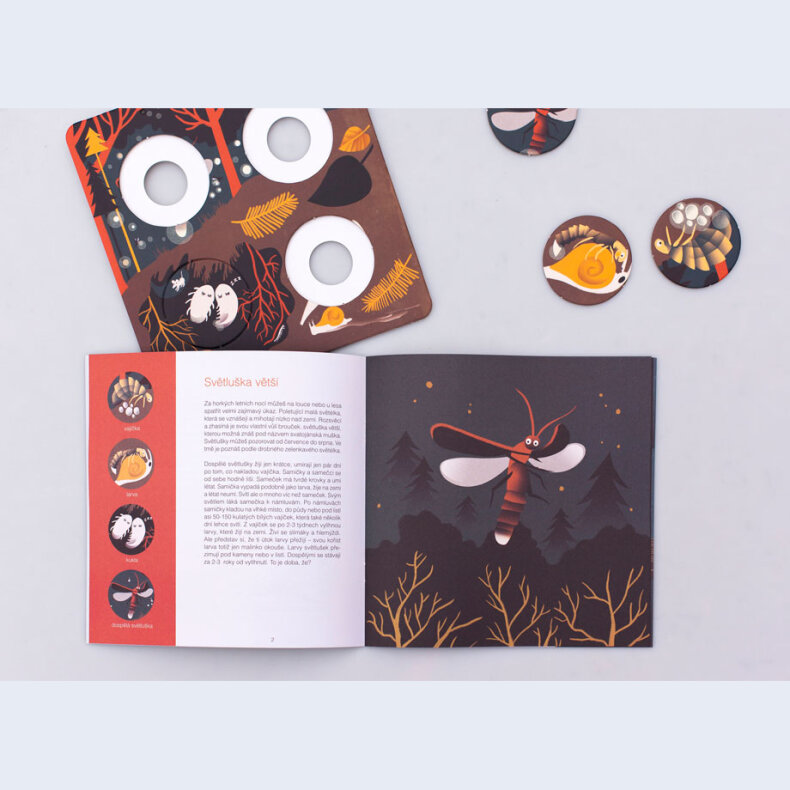 Interaktivní kniha o životě 6 nočních zvířat. Správným sestavením žetonů objevíte celý vývoj netopýra, puštíka, kuny, lišaje a světlušky. Ve tmě kartičky svítí a odhalují další malá tajemnství.