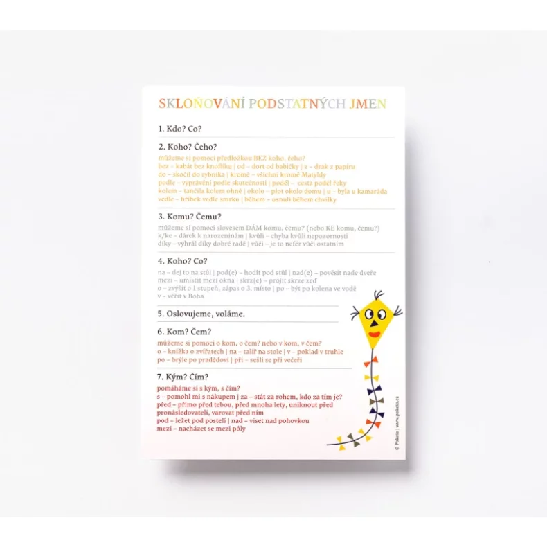 Karta je vhodná pro žáky a žákyně třetích tříd i všechny, kteří potřebují protrénovat a upevnit si znalosti pádových otázek.