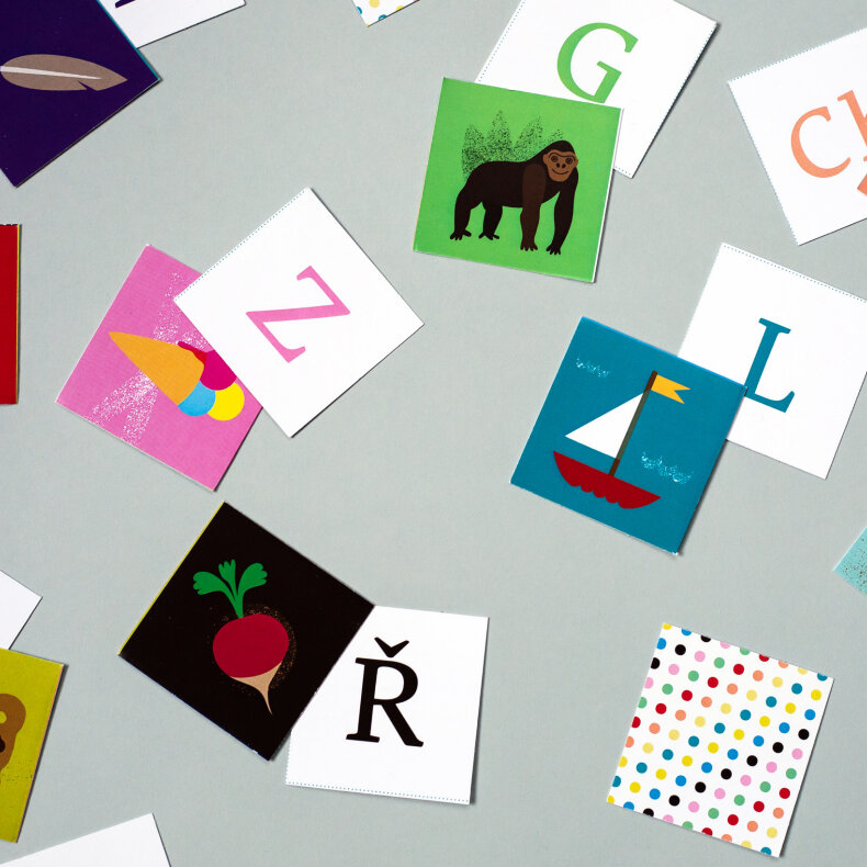 Abeceda hrou: procvičte si s dětmi českou abecedu díky pexesu. Najděte dvojici písmeno a slovo, které jím začíná. Pokročilí hrají klasicky a ti, co se teprve s abecedou seznamují, můžou hrát třeba s odkrytými kartami.