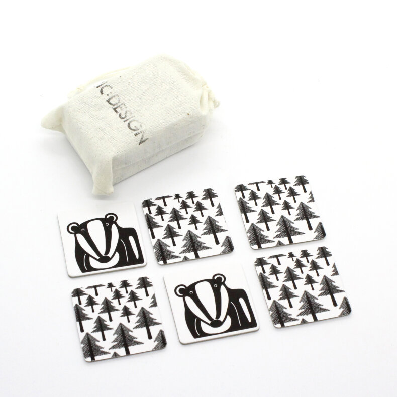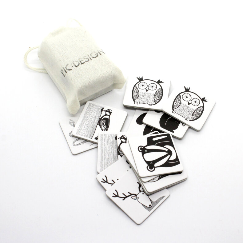 Balení obsahuje karty s motivem jezevce, veverky, hada, strakapouda, jelena, kance, kuny a sovy. Karty jsou tištěny na kvalitním kartonovém papíru, velikost jedné karty je 4 cm x 4 cm x 1,7 mm. Pexeso je ideální na cesty, protože je zabaleno ve stahovacím lněném pytlíku.